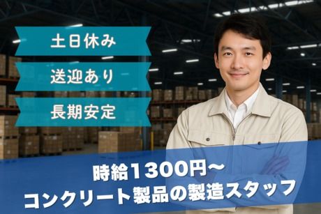 仕事内容 <注目ポイント!> ●時給1300円の高時給! ●月21万円以上も可! ●未経験からの挑戦OK! ●工場デビュー歓迎! ●フリーターOK! ●シンプルなモクモク作業! ●細かい作業が好きな方にオススメ! ●特別な資格や経験は一切不要! ●長期で安定した職場環境! ●土日休みでプライベートも充実! ●10~60代のスタッフ活躍中! ●ご自宅近くでの出張面接も可能です! <建設資材・コンクリート製品の製造> 大型施設やビルなどで使用される コンクリート製品の製造のお仕事です。 重たい物を持つ作業は一切ナシ! 作業は複数人体制で進められ、 チームで協力しながら進行します◎ 最初は ”コンクリートの気泡を潰す” カンタンな作業からお任せします♪ ▼業務内容▼ ●型枠の組み立て ●鉄筋の骨組みを型枠に設置 ●コンクリートの気泡を潰す など 資格や経験は不要! 難しい作業もありません。 未経験の方でも大歓迎◎ 先輩がしっかりサポートしてくれるので 長く安定して働ける環境です! 体を動かして働きたい方や、 黙々と作業をしたい方にオススメ! <しっかり働いて、しっかり休める好環境!> 勤務時間は7:30~17:00の実働8時間 休憩はしっかり90分確保! 体力的にも無理なく働ける環境です◎ 土日休みなので、 週末は家族や趣味の時間を楽しみながら リフレッシュできます♪ ワークライフバランスを大切にしたい方 にピッタリのお仕事です☆彡 ★===============★ !モクモク×簡単作業! !重い物を持つ作業はナシ! ★===============★ <幅広い世代の方が活躍中!> 工場デビュー歓迎! どなたでも安心してチャレンジできる お仕事です◎ 10代~50代・60代まで、幅広い世代が 活躍しており、新しい環境でも すぐに馴染める職場です! 初めての方でも安心して始められるよう 先輩スタッフが丁寧にお教えします♪ *…*…*…*…*…*…*…* 未経験でも一歩ずつ スキルアップできる職場! *…*…*…*…*…*…*…* <株式会社アネックスのポイント> [1]高時給&長期勤務案件が豊富! [2]安心の専属コーディネーター制! ┗派遣後も安心のフォロー体制が 整っています! [3]キャリアコンサルタント資格保持者が在籍! ┗お仕事のお悩みやキャリアアップ、どんな 仕事が自分にあっているかなどの相談を 承っています!