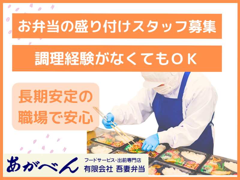 仕事内容 //////////////////////////////////////////// 〇盛付台にてお弁当の盛付け ○ラインによる流れ作業でのお弁当の盛付け 「あがべん」でお馴染みの有限会社吾妻弁当 が新しいスタッフを募集! 生活に欠かせない食に関するお仕事 始めませんか? 長期で安定して働ける職場です。 ////////////////////////////////////////////