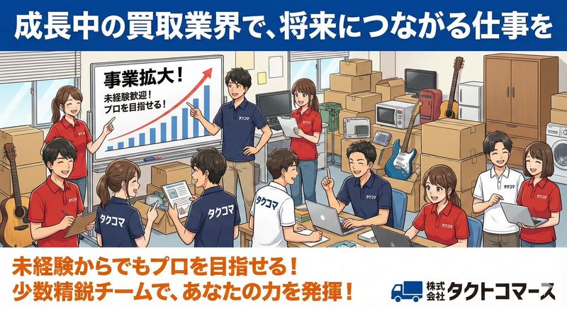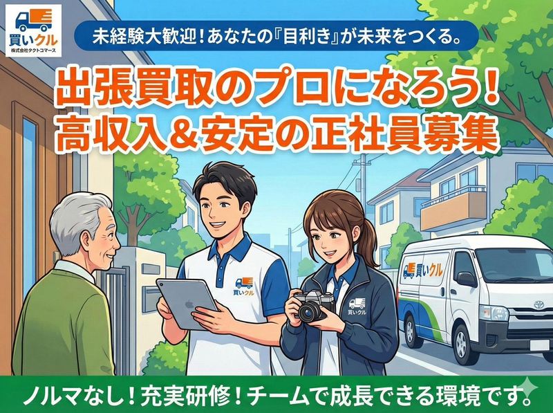 仕事内容 事前にアポイントが入っているお客様のご自宅へ訪問し、 家具・家電・ブランド品・日用品などの査定・買取を行うお仕事です。 主な業務内容 お問い合わせいただいたお客様宅への訪問 お品物の確認・簡単な査定 買取金額のご説明・ご成約 商品の運び出し・積み込み ※ 事前にアポイントが入っているお客様のみ対応します 未経験でも安心 査定方法・接客マナーは丁寧に研修 最初は先輩スタッフと同行からスタート 査定が難しい場合は、会社に確認しながら対応可能 「ブランドや相場の知識がない」という方でも、 働きながら自然に身につく環境です。 この仕事の魅力 お客様から「助かりました、ありがとう」と直接感謝される仕事 毎日違う現場で、単調にならない 頑張り次第で収入アップを目指せる 体を動かす仕事が好きな方に向いています こんな方に向いています 人と話すことが好きな方 運転や外回りの仕事が苦にならない方 安定した仕事を探している方 将来、買取・リユース業界で成長したい方 帰社後の簡単な報告業務 ※ 飛び込み営業・テレアポは一切ありません ※ 事前にアポイントが入っているお客様のみ対応します