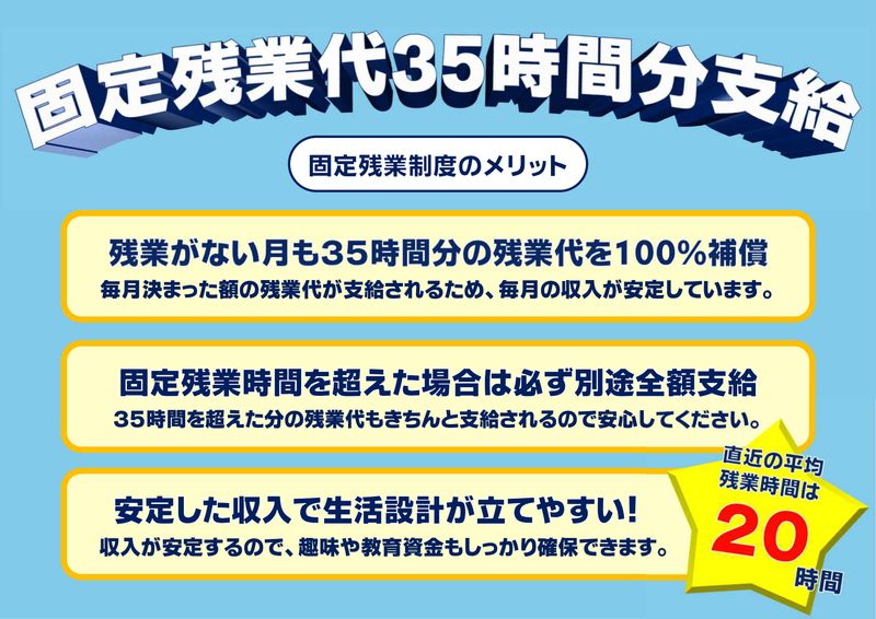 仕事内容 \働きやすさに自信アリ!/ 長期で活躍する社員が多いのが 当社の魅力です! - ✦魅力ポイント✦ ・業界未経験OK ・手積み荷卸しなし ・長距離運転なし(運転時間は1日3h程度) ・日勤のみ/残業少なめ ・日祝・隔週土休み ・長期休暇あり/年休100日 ・1年目で月30万円以上可能 ・食事補助制度あり - 「もっと家族との時間が欲しい」 「働き方を変えたい」 そんな理由で転職してきた社員多数◎ - 仕事内容 - 大型ミキサー車 生コン車ドライバー 工場で製造された生コンクリートを 取引先の建設現場まで運搬する業務です。 実働8hの中でドライバー業務は3hほど。 あとの時間は待機や洗車が中心になります。 - 給与 - 月給:30万~37万円 モデル年収例:400万~430万円 ※固定残業代・一律手当含む ※交通費全額支給 ■手当あり 一律勤続給 固定残業代/35h 諸手当 運行手当、距離手当、応援手当、 危険物手当、整備手当 等 ■昇給:年1回 ■賞与:年2回(7月・12月) ■決算賞与:実績あり