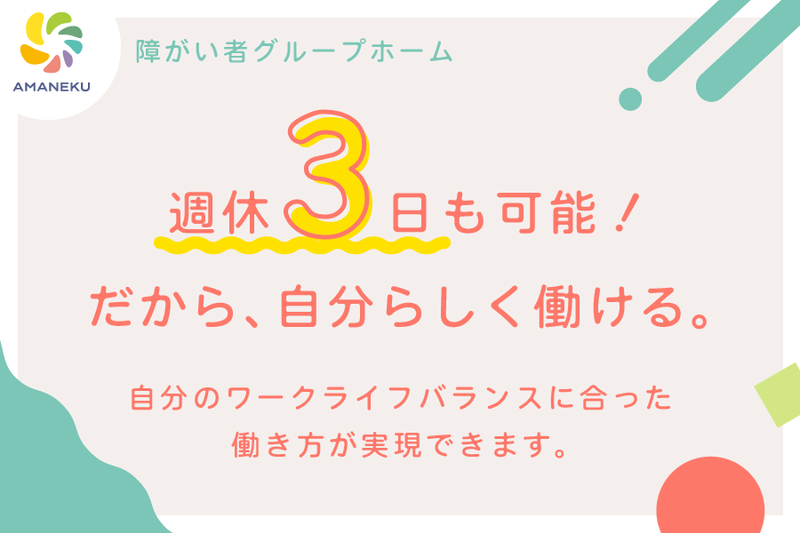 仕事内容 〇2026年3月オープンの新築拠点! 日中サービス支援型グループホーム「AMANEKU」の管理者(ホーム長)業務をお願いします。 具体的な仕事内容  ̄ ̄ ̄ ̄ ̄ ̄ ̄ ̄ ̄ ̄ ̄ ̄ ■入居者様との雑談、 日常生活・社会生活上の相談及び助言、援助 ■食事準備 ■入居者様の入浴、排せつ等介助 ■洗濯、共用部分の掃除等の家事 ■関係機関との連絡調整 ■病院、買い物等同行支援 ■レクリエーションなどの企画(入居者様のお誕生日会など) ■スタッフ育成、採用、研修 ■シフト管理 ■その他関連業務 ―●アピールポイント●―――――― ●社宅・転居費補助応相談 ●週休3日も可能 ●年間休日最大157日(年度の暦により若干変動) ●入職時期相談可能 ――――――――――――――――― グループホームとは?  ̄ ̄ ̄ ̄ ̄ ̄ ̄ ̄ ̄ ̄ ̄ ̄ グループホーム「AMANEKU」は、 定員数20名(1階10名・2階10名)で運営する、 新築・完全バリアフリーの『日中サービス支援型』 障がい者グループホームです。 重度の障がいのある方でも安心してお住まいいただけるよう、 日中を含む24時間の支援体制や住環境に配慮した、 新たな法制度に基づくサービスです。 充実の研修体制で未経験でも安心  ̄ ̄ ̄ ̄ ̄ ̄ ̄ ̄ ̄ ̄ ̄ ̄ ■マニュアルシステムと 動画研修を用いた基礎研修 ■介護福祉士をはじめとした 先輩社員による実践研修 ■毎月新たな研修内容が配信され、 安心して働くことのできるトレーニングコース ■上長との定期1on1で 業務の悩みをいつでも相談できる体制 *メッセンジャーアプリの会社用アカウントを 全職員に付与し、いつでも専用アプリで 業務相談ができる環境です ::.。.: .。.: .。.: .。.::.。.: .。.: .。.: .。.::.。.: .。.: 【●AMATUHIについて●】 当社代表もかつて障がい当事者。 そのため「AMANEKU」では、 当事者目線を大切に、 入居者様の皆様が安心安全に自分らしく 過ごすことのできる居場所となれるよう、 日々チーム一丸となって努力しています。 チームと共に、一緒にグループホームを 作ってくださる方をお待ちしております。 ▼他にも求人多数募集中! https://arwrk.net/recruit/vdsmm7c330413x1 ▼グループホームAMANEKU 紹介ページ https://amaneku-home.jp ▼株式会社AMATUHI企業ホームページ https://amatuhi.co.jp/ ::.。.: .。.: .。.: .。.::.。.: .。.: .。.: .。.::.。.: .。.: