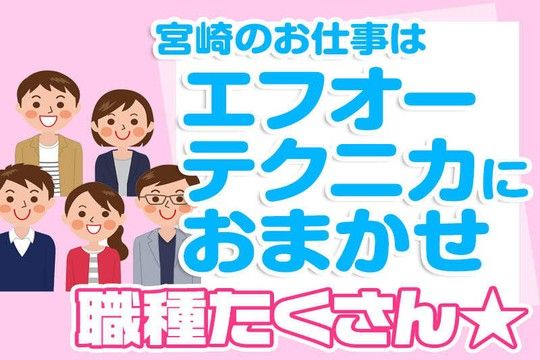 ■応募後の流れ //////////////////////////////////////////////////////////////////////////// <応募・お問い合わせ> ①「応募ページへ進む」からエントリー下さい。 ※メールでの応募・電話での応募先があります。 ②この画面から、直接お電話でのお問い合わせ ※0985-72-7503又は 0120-606-656よりお問い合わせ下さい。 ※受付時間・・・8時30~17時00 当社ホームページにも求人掲載をしています。 是非ご覧下さい。 http://www.fo-technica.com/jobs/ //////////////////////////////////////////////////////////////////////////// 1.24時間以内に担当者からお電話またはメール致します。 ※土・日・祝のご応募の際は、月曜日にご連絡させて頂く場合があります。 2.面接及び勤務地の見学 3.採用可否の連絡 2日以内 4.入社手続き及び受入教育 5.入社(ご希望日又は就業先リクエストで対応) ■応募受付電話番号 0120-606-656 ※電話番号に関する補足: 8:00~17:00 ■個人情報の取扱いについて ご提供いただいた個人情報は、採用選考及び結果等の通知・連絡の為に利用いたします。 それ以外の利用目的または法令等に基づく要請の範囲を超えた利用はいたしません。