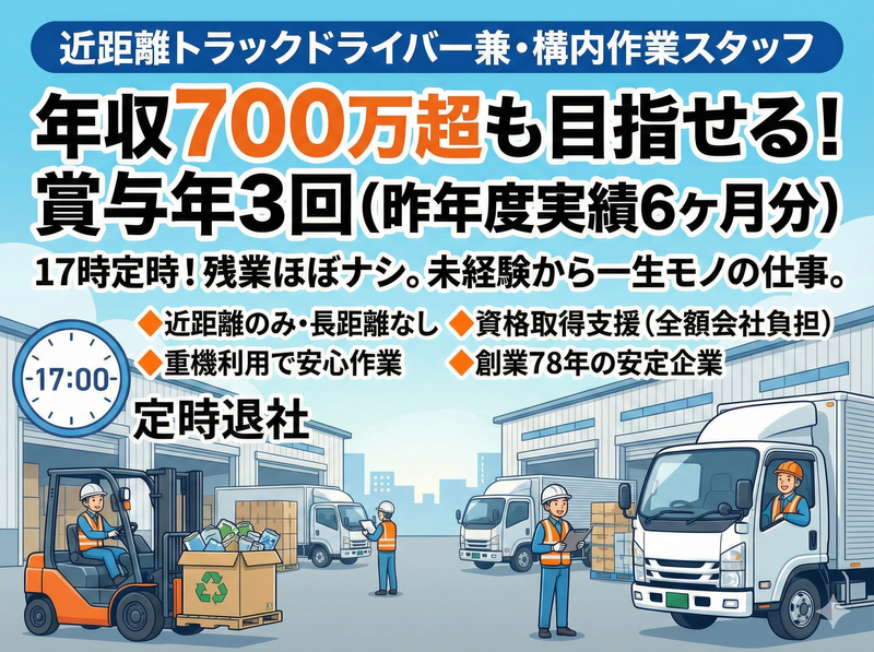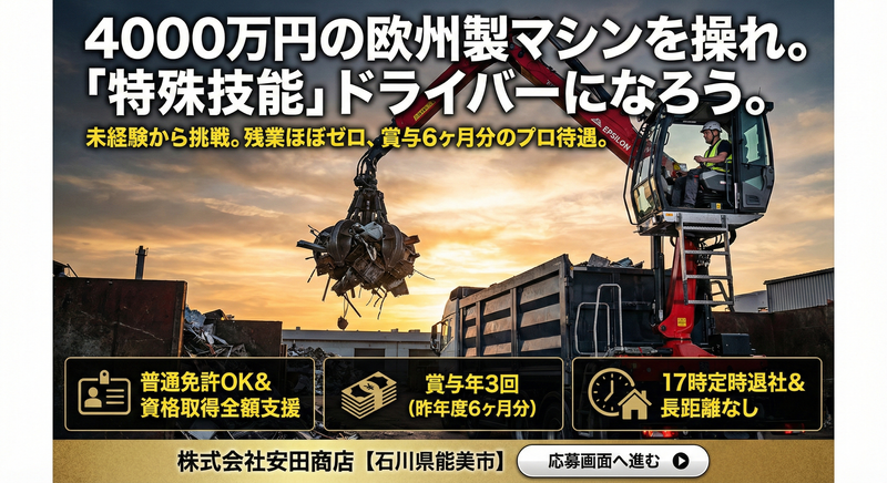 仕事内容 \未経験からチャレンジしませんか/ ただ走るだけじゃない。 「特殊技能」を持つドライバーへ。 4~10tトラックのハンドルを握り、 石川県内のルートを回る。 現場に着いたら、 背中に積んだ「イプシロン(EPSILON)」の出番。 これは欧州製の最新鋭クレーン。 価格にして約4000万円。 まるで自分の手のように動く このマシンを操り、 重量物をトラックへと積み込む。 力任せの作業はない。 必要なのは、レバーひとつで 巨大なアームを制御するセンスと技術。 【✨車好き・メカ好きのために】 1. レアな機体 業界では「ヒアブ」がメジャーですが、 ウチが使うのは欧州の「イプシロン」。 パワーショベルのような感覚で、 UFOキャッチャーのように 上から掴んで積み込む。 この操作感、メカ好きにはたまらないはず。 もちろん、繊細な作業が必要な時は 「ユニック(吊りクレーン)」も使いこなす。 「あいつ、あのマシン扱えるのか」と 一目置かれる技術が、ここで手に入る。 【✨運ぶのは「価値ある資源」】 解体現場や工場から出る金属がターゲット。 ただの鉄くずじゃない。 時には 船のプロペラ(ステンレス・ニッケル)や 吹奏楽の楽器(銅・亜鉛合金)など、 特殊な金属も扱う。 「これはどういう素材か?」 を見極める目利きの力も 一生モノのスキルになる。 【✨プライベートを充実させる】 長距離運転なし。 県内のみのルート回収。 17時にはキッチリ業務終了。 ダラダラ残業はカッコ悪い。 サクッと帰って、 愛車のメンテナンスをするもよし、 家族や仲間との時間を過ごすもよし。 メリハリを持って働ける環境だ。 【1日のスケジュール例】 ~リズム良く働き、定時で帰る~ ▼08:00 始業・確認 今日のルートと段取りを確認。 プロの仕事は準備から始まる。 ▼08:30 出発(ドライブ) 4tまたは10t車で現場へ。 石川の道を大型車で流す。 ▼10:00 現場到着・マシン操作 イプシロン(クレーン)を展開。 掴んで、積む。 スムーズな操作で荷台を満たしていく。 力仕事は重機に任せればいい。 ▼11:00 帰社・目利き(仕分け) 回収した金属の選別。 素材ごとの特性を見抜き、価値を判断する。 ▼12:00 休憩(60分) 改装直後の清潔な休憩室でリフレッシュ。 午後のためにしっかり休息をとるのも仕事のうち。 ▼13:00 午後のラウンドへ 再びトラックに乗り込み、午後の現場へ。 ▼15:00 帰社・構内作業 荷下ろし、翌日の準備、整理整頓。 ガス切断機を使った加工作業など、 技術の見せ所もある。 ▼17:00 業務終了 お疲れ様でした。 今日も残業はほぼナシ。 明るいうちに帰路へつく。 【入社者インタビュー:20代男性】 ・車が好きで重機も乗ってみたいと思い入社しました。 ・トラックや重機を乗りこなすのが楽しいです。 ・賞与も6ヶ月分支給されるので、 愛車のメンテナンス費用に回せて、 仕事もプライベートも充実しています!