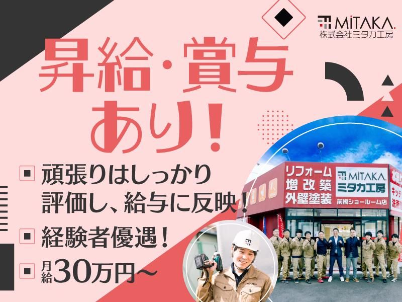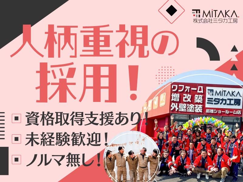 仕事内容 リフォーム専門店でのお仕事です! ●具体的には… ◇設備・内装等の工事 ◇工事前工事中や工事後のお客様対応 ◇PCやスマホでの工事報告や写真のアップ 入社後は、先輩社員に同行し、 まずは業務を覚えることからスタート! 指導を受けながら、水回り・外壁塗装などの 専門知識や技術を身につけます。 ✅ノルマなし! ✅充実した研修で安心! ╋━━━━━━━━━━━━━━━━ ⏩週休2日制!長期休暇あり! ⏩学歴不問!無資格ok! ⏩研修・福利厚生が充実!働きやすい◎ ⏩昇給年1回!賞与年2回! ⏩頑張りはしっかり評価し給与に反映! ⏩【 人柄重視 】の採用です! ━━━━━━━━━━━━━━━━━╋ 【研修が充実!】 しっかりした研修があるのでリフォームのお仕事についてしっかり学べます。 頑張った分だけきちんと評価されるから高収入も望めます! 【ミタカ工房について】 創業26年!施工実績・件数 群馬県内最多の地域密着総合リフォーム店! 地域密着を基本方針に掲げ、スタッフ・お客様・業者・地域など全てを幸せに出来る仕組みづくりに努めています。 社内外の研修など、能力の向上や結束を高める環境づくりに力を入れています。 住宅リフォームは前橋市内にショールームを2店舗構え「見て、さわって、納得できる体感型ショールーム!」として、お客様が来店して頂くスタイルになっており、大変ご好評いただいています。