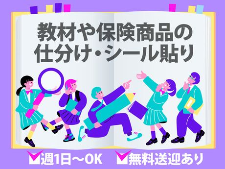 仕事内容 教材や保険商品の仕分け・シール貼り ▼週1日~プライベート重視でOK!  ̄ ̄ ̄ ̄ ̄ ̄ ̄ ̄ ̄ ̄ ̄ ̄ ̄ ̄ ̄ ̄ 北坂戸駅から無料送迎あり! はじめてでも安心のカンタン軽作業♪ 教材や保険商品を取り扱うお仕事! 重たい物はないので負担も少なめです◎ <具体的には> 出荷先ごとに仕分ける 宛名のラベルをペタっと貼る など 初めての方でも半日あれば覚えられます! それでもわからないことは先輩staffが 丁寧にサポートするので安心して下さいね♪ 20代~50代迄幅広く活躍中! 会話少なめ!!コツモク簡単作業◎ ★☆ スポット・ド短期・単発OK ☆★ ●働き方は自由自在! ●スキマ時間や空いている日を有効活用できる! ●平日だけ、土日だけもOK! ●1日~OKのスポットワーク! ━━━━━━━ ★こんな方に★ ━━━━━━━ ■長期休暇に自由にお金を使いたい! ■週末の飲み会に向けてお金が欲しい ■会話少なめで簡単な仕事が欲しい など ★☆嬉しいメリットを教えてください!☆★ 【1】日払いOK 「急な出費のときに本当に助かる…」 「欲しいものがすぐに買えます♪」 「遊ぶ予定の前にサクッと稼いでます!」 【2】短期OK 「長期休みのときだけ働いてます!」 「次の仕事が決まるまでの"繋ぎ"で」 「季節限定のオシゴトだけ♪」 【3】シフト自由 「週1、2日で無理なく働けてます◎」 「学校がない土日メインのシフトです!」 「夜勤も選べるのでWワークで働いてます」 ★☆ スタッフの声 ☆★ 「家庭と両立して働けています。 子育てが落ち着いたらもう少し シフトを増やしてみようかな!」 「アルバイトをしていたけど 急にシフトに入れなくなって 困っていたときに応募しました!」 みなさん、学校・家庭・他のお仕事など と上手に両立しながら働いていますよ♪