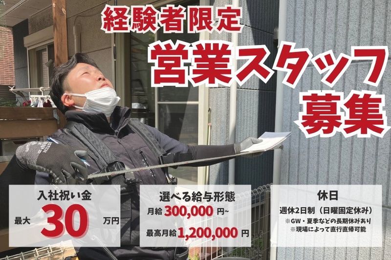 【アピールポイント】 【入社祝い金最大30万!】 足場工事会社で足場営業を正社員募集! ■前職給与保証・月給120万稼げる ■どこよりもあなたを評価いたします! ■個人ノルマ無し(チーム制) ■幅広い施工実績で地域No.1!! 【必須】いずれかの経験者の方限定 ・足場営業経験 ・足場職人 ・建設業 ・建設営業(BtoB)