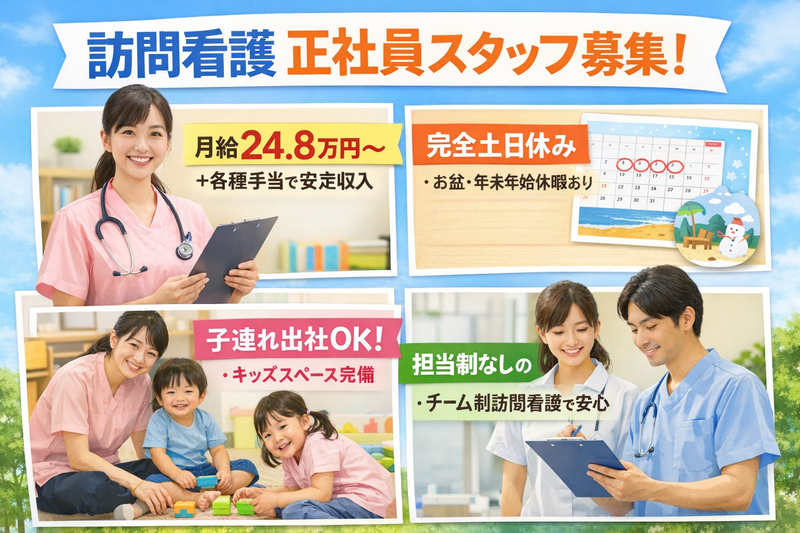 仕事内容 ✅月給24.8万~、生活に不安を残さない ✅土日休みで家族との時間を守れる ✅ 一人で抱え込まないチーム制☘ ✅子連れ出社OK!キッズスペースあり ✅働き方を選べて無理なく続ける ─┘─┘─┘─┘─┘─┘─┘─┘─┘─┘ ⏩“大切にする”を、理念で終わらせない  ̄ ̄ ̄ ̄ ̄ ̄ ̄ ̄ ̄ ̄ ̄ ̄ ̄ ̄ ̄ ̄ ̄ ̄ ̄ 私たちが目指しているのは、 医療を提供することそのものではなく、 「大切な人を大切にできる暮らし」 が続いていくこと。 ご利用者様はもちろん、 一緒に働く仲間、その家族まで含めて 無理が生まれない仕組みをつくることが 訪問看護ステーションとしての 責任だと考えています。 医療・介護・地域をつなぎ、 住み慣れたご自宅で過ごす時間を支える。 そのために、 一人に負担を背負わせないチーム制と ライフステージに合わせて働ける環境を 整えてきました。 ─┘─┘─┘─┘─┘─┘─┘─┘─┘─┘ ⏩仕事内容  ̄ ̄ ̄ ̄ ̄ ̄ ̄ ̄ ̄ 利用者様のご自宅を訪問し、 訪問看護サービスを提供します。 「一人ではない」体制のもと、 チームの一員として 地域の暮らしを支える看護です。 <主な業務内容> ▶バイタルサイン測定 ▶服薬管理 ▶点滴、注射、採血 ▶吸引、在宅酸素管理 ▶褥瘡予防・処置 ▶カテーテル、胃瘻、ストーマ管理 ▶医療機器管理 ▶移動、排泄、清潔ケアなどの 日常生活援助 ▶看取りケア ▶精神的サポート ⭐担当制ではなくチームで利用者様を支援 ⭐医師・ケアマネとの外部連携は 管理者が中心となって対応 →訪問と記録に集中できる環境です♪ ─┘─┘─┘─┘─┘─┘─┘─┘─┘─┘ ⏩ここで働く“本当のメリット”  ̄ ̄ ̄ ̄ ̄ ̄ ̄ ̄ ̄ ̄ ̄ ̄ ̄ ̄ ̄ ̄ 【子育てを前提に考えた職場設計】 事務所内にキッズスペースを完備。 お子様を連れての出社も可能です。 急な保育園・学校行事の変更時も、 仕事に集中できる環境を用意しています。 【一人で抱え込まないチーム制看護】 地域ではまだ多い担当制ではなく、 当社ではチームで利用者様を担当。 緊急時も一人で判断を抱えず、 相談・共有しながら対応できます。 【業務負担を減らす役割分担】 医師・ケアマネとの外部連携は 管理者がメインで対応。 訪問スタッフは、 「訪問」「記録」 という本来の業務に集中できます。 【働き方を選べる2つの勤務スタイル】 ※勤務日・休日は共通。 オンコール対応の有無を選択できます。 ⏰8:30~17:30 (オンコールあり) ⏰9:00~17:00 (オンコールなし/メンバー応援タイム) ライフスタイルや家庭状況に合わせて、 オンコール対応を担うかどうかを選択可能。 日中の訪問業務に集中したい方にも 適した働き方です。 【訪問スケジュールに合わせた働き方】 ※上記いずれの勤務スタイルでも共通です。 朝の申し送り後は、 訪問スケジュールを基準に時間調整が可能。 一度自宅に戻ったり、 外でランチを取ったりと、 無理なくメリハリをつけて働けます。 ─┘─┘─┘─┘─┘─┘─┘─┘─┘─┘