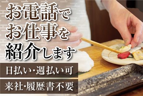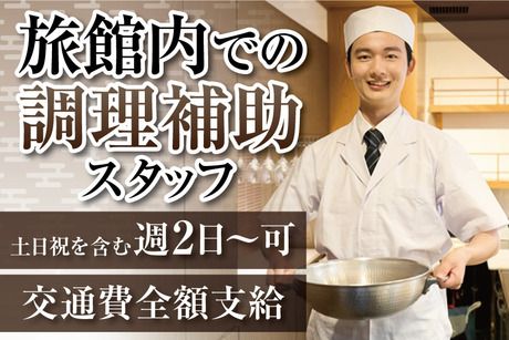 仕事内容 ■老舗の温泉旅館内での調理補助業務 お客様へ提供する懐石料理の調理補助のお仕事です。 未経験OK!簡単な作業からお任せするので安心♪ 料理するのが好きな方歓迎◎ プロのスキルを間近で学ぶことができるのも魅力です! <調理業務> ・盛り付け ・野菜の刻み ・煮物調理 ・焼き物調理 など <調理以外> ・洗い物 ・片付け ・清掃 ・その他付随する業務 ■未経験OK!20代~50代のスタッフが活躍中です! 「料理するのが好き」 「家事のスキルを活かせるお仕事」 「旅館で働きたい」 など、動機はなんでもOK◎ 未経験からのチャレンジを応援します! 丁寧な研修から始めるのでご安心ください♪ もちろん、調理師免許をお持ちの方や 飲食店での調理スタッフ経験がある方は大歓迎! あなたのスキルや経験をぜひ活かしてください! ■週2日~&1日4時間~OK!シフトはご相談ください! 「午前中だけの時短勤務」や 「お昼からフルタイムで!」など、 あなたのご都合に合わせたシフトでOK! また、週2日から働けるので、 家事や育児と両立しながら働くことや、 Wワークで働くことも可能です◎ ■来社&履歴書不要!電話でお仕事のご紹介が可能です。 今回募集しているお仕事に関して もっと詳しく説明してほしいと思われた方には、お電話でしっかり説明します。 来社&履歴書不要でお仕事のご案内が可能なので 仕事が休みの日や仕事終わりなど、 あなたの都合のよいタイミングで連絡いただければ希望のお仕事を案内しますので まずはご応募ください。