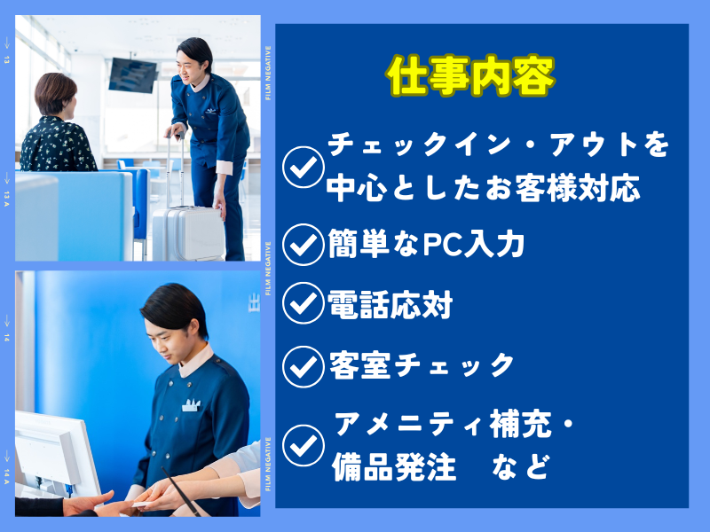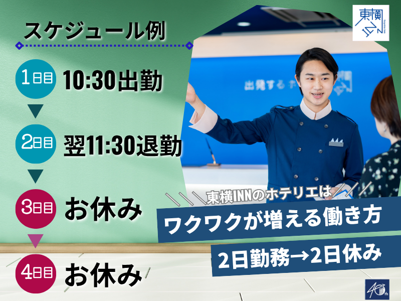 仕事内容 \この求人のPOINT/ ▶ 月給24万円~+賞与年2回 ▶ 等級制度で昇給・昇格を目指せる ▶ 未経験から接客スキルが身につく ▶ 1回出勤後は2連休 ▶ 複数名体制で安心して始められる ・‥…━━━━━━━━━━━━━…‥・ 東横INNのホテリエは、 受付だけで終わらない接客職です。 お客様をお迎えしてから翌朝まで関わる中で、 言葉づかいや対応力だけでなく、 周囲を見て動く力や判断力も身についていきます。 <具体的な仕事内容> ・チェックイン、チェックアウト対応 ・予約受付やお問い合わせ対応 ・自動チェックイン機で戸惑うお客様のサポート ・館内設備や周辺施設のご案内 ・朝食準備、館内の簡単な清掃、見回り ・‥…━━━━━━━━━━━━━…‥・ 未経験からでも始められ、 日々の頑張りや成長は等級制度でしっかり評価。 続けるほど、できることが増え、 自分の成長を実感しやすい仕事です。 ホテリエとして経験を積むことで、 将来的には支配人や本社・グループ会社など、 次のキャリアを目指すこともできます。 さらに、資格取得支援制度や資格手当もあり、 身につけた知識やスキルが 収入にもつながっていく環境です。 業務は複数名体制で進めるため、 わからないことをすぐに確認できる環境です。 ホテル勤務が初めての方も、 少しずつ経験を積みながら慣れていけます。