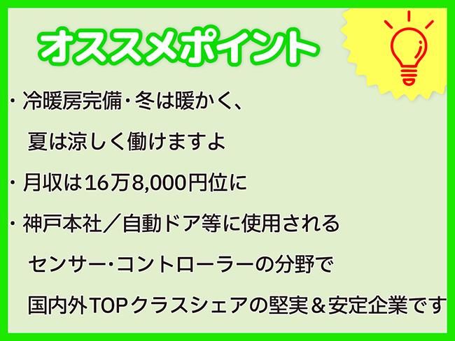 仕事内容 検品、部品の入庫・出庫作業や保管業務など明るく清潔な倉庫内での軽作業をお願いします。そしてシンプルで身体への負担が少ない軽作業のお仕事です。未経験の方も入って1週間くらいで慣れてもらえると思いますので、このお仕事が初めての方でも安心してご応募ください。また作業手順などもあなたの覚えるスピードに合わせて丁寧にお教えします。勤務曜日は(月)~(金)、平日のみなので祝日はお休みになります。勤務時間は9:00~17:15(実働7時間30分・休憩45分)、なお月に5回(週に1回位)「時短勤務」の相談も可能です。※時短勤務とは?→9時30分開始や10時開始や、15時45分終了や16時15分終了など、「実働6時間程」での勤務形態の弊社内の呼称です。 【お仕事PICK UP!】 女性スタッフ多数活躍中 経験不問・未経験者大歓迎 駅チカ・バイク通勤&自転車通勤OK 空調完備/綺麗で快適な仕事場です (月)~(金) 基本週5日のお仕事 実働6時間位での勤務時間帯の相談可 【旭光電機 明石工場ではこのような製品を作っています】 ■駅のホームドア用のセンサー・コントローラー ■電車のブレーキコントローラー ■大型船舶の電子制御機器 ■ビールサーバー用周辺機器 など