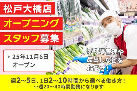 仕事内容 【 お仕事内容 】 ★技術が活かせる現場です◎ ★社員登用制度ありで安定勤務 ――――――――――――― こんなことをお任せします! ――――――――――――― 最初は値付け・品出しから始めて 慣れてきたら売り場づくりなどもお願いします! 季節の野菜や果物の知識が増えていくのも この仕事の魅力のひとつ! 普段の買い物でも活かせますよ♪ 【 しっかりした研修あり 】 仕事のやり方やルールまわりなど 基礎から実践までじっくり身につけられます! ・経験豊富な社員がしっかりサポート! ・分からないことも、すぐに聞ける環境◎ ⇒勤務初日から1人にさせない安心の職場です♪ 【 始めやすい環境です 】 仕事終わりにそのまま買い物できる♪ 「時間も手間も節約できて助かる!」 という声が多数届いています! 安心&安定して働ける職場です! しっかりした研修&サポート体制があるから 未経験でも安心スタート! 大手ならではの安定感があるのも魅力のひとつ♪ 【 松戸大橋店へのアクセス詳細 】 北国分駅「北口」を出て ウェルシアさん方面の大通りへ進み ココスさんや西松屋さんがある道を直進します。 6分ほど歩くと右手にENEOSさんがあるので その手前が店舗です! バスの場合だと、 京成バス「一条会病院」下車して 目の前が店舗です! 【 勤務形態について 】 この求人はパートナー社員の募集です! パートナー社員とは? 週20時間以上働く勤務形態です。 社会保険に加入でき、週40時間のフルタイム勤務など 契約社員のような働き方も可能です。 ※パートナー社員以外には アシスタントパートナー社員という働き方もあります。 アルバイト・パートとして、週20時間未満で働く 扶養内勤務可能な勤務形態です。