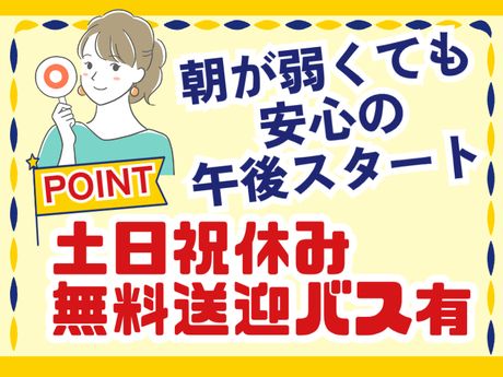 職場環境 【従業員構成】 男女比は男性4割、女性6割!30代前半中心に活躍中の職場です! 【職場の雰囲気】 立ち仕事 お客様との対話は少ない 初心者活躍中 力仕事が少ない 決められた時間できっちり 知識、経験不要