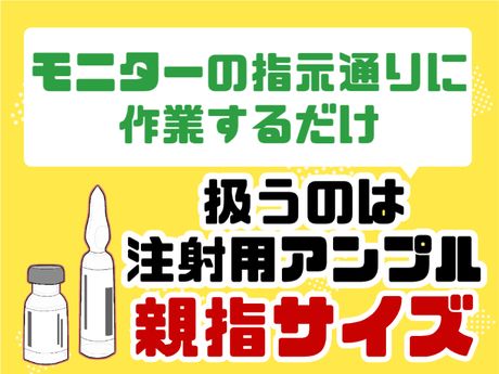 仕事内容 大型ロジスティクスセンターでのお仕事! <大型ロジスティクスセンターの冷蔵室でのお仕事> ★扱うのは、注射用アンプル(小瓶に入った注射液)など軽くて親指くらいで小さいサイズ ●レーンに流れてきた商品を取りトレーにのせる ●モニターに表示されている商品名と数が合っているか確認 ●キズや割れがないか確認 【冷蔵室での作業です】 室温は4~8℃です。 専用の上下ジャンパーを着用するため、寒くないです 1時間に1回、5分程度の休憩あり(通常休憩とは別です) これからの暑い季節に涼しい場所でお仕事しませんか? 事前の職場見学で室温の確認もOK♪ ★月の半分は定時で帰宅!残業は毎月カレンダーが掲示されているので予定を立てやすい ★入社から段階的に昇給有 ★ジュース・アイス・菓子パンなどの自販機充実 ★薬の知識など一切不要! \就業前に確認できる!!/【希望者向け!職場見学実施中!】 職場の雰囲気や仕事内容などを直接見れる! 職場までの通勤距離やルートの確認にも最適です♪ 見学してから就業した方の定着率は90%以上!見学後に、入社する・しないを決められるため安心です。