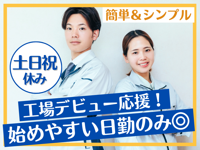 仕事内容 \未経験スタート大歓迎!/ 日勤のみ&土日祝休みで 工場デビューにぴったり♪ 学歴不問&年間休日125日だから 安心して長く働けます◎ お任せするのは、部品の組立や 目視検査などのシンプル作業。 モクモク進められるから 初めてでもすぐに慣れます! ノルマはありません ライン作業ではありません ■■■■■■■■■■■■■■■■■■■ 誰もが知っている大手企業様の工場で プラスチック製品の製造工程における 組立作業や検査をお願いします! 【詳しい内容は…】 ◆部品の組立作業 ◆完成品の目視検査や不良品の選別作業 ◆生産ラインの管理・調整サポート ◆製造記録の記入や報告業務 ◆安全ルールの遵守、整理整頓 など ――――――――――――――――――― 【この仕事のやりがい、メリットは…】 年間休日125日・完全週休2日制 (土日祝休)で、オンとオフのメリハリを 大切にしながら働ける環境です! 学歴や経験を問わない募集なので、 「初めて製造業に挑戦したい」という方に ぴったり◎ 作業はチームで行うため、仲間と協力 しながら進めるスタイルで安心感が あります。 長期安定できる大手工場で、腰を据え じっくり働きたい方にとって最適です‼ ――――――――――――――――――― 「自分にできるかな…」と不安な方は まずは見学だけ、もOK! ちょっとでも気になるなと思って 頂けたなら、是非お気軽にご連絡下さい! 定位置・同姿勢の作業ではないので身体も安心 ―――――――――――――――――――