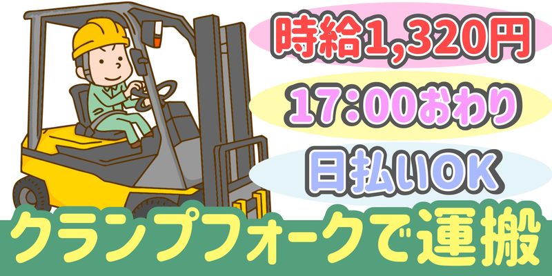 仕事内容 紙製品を扱う企業でのクランプフォークのオシゴト ・積み込みや積み下ろし、運搬 ・ロール紙を押して動かす作業 ~などもお願いします ブランクがある方でもダイジョウブ!資格&経験活かせます 出張面接いたします!就業前の職場見学OK! まずは、お気軽にご応募ください! 20歳~50代前半の男性活躍中 ・就業場所は、熊谷市立吉岡小学校 近郊 オススメpoint ・週休2日制 ・午前と午後に小休憩あり こまめに休憩がとれる環境です ・長期連休(GW・夏休み・年末年始など)あり ・作業着&靴はうれしい貸与 ・仕出し弁当の注文◎ もちろん持参もOK ・ロッカーあり ・駐車場あり らくらくマイカー通勤 ・要フォークリフト免許 ・日勤のお仕事お探しの方 ・長期で働きたい方 ・資格を活かして活躍したい方 ・残業少なめでプライベートも充実させたい方 ・1月あたり平均残業時間10h 【こんな経験活かせます!】 パート、アルバイト、契約社員 雇用形態問わず、下記の経験ある方は活かせます! ・倉庫内(構内)作業 ・フォークリフト(クランプ) ・入出荷作業 ・運搬 ・積み下ろし ・積み込み ※もちろん必須ではありません! まずはお気軽にご応募ください ///////////////////////////////////////// (WEBでご応募の場合) お電話番号を記入していただくと ご案内がスムーズです。 /////////////////////////////////////////