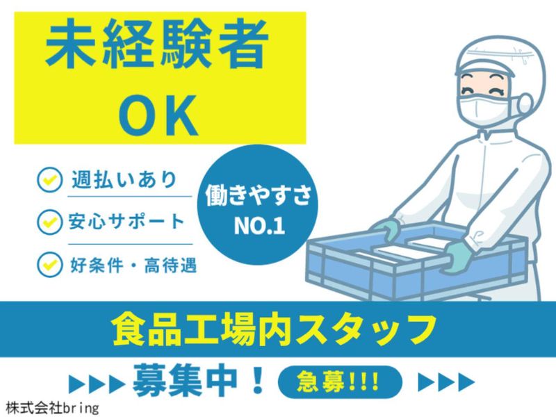 仕事内容 ★あの有名チーズの製造・箱詰めスタッフ募集★ 普段、コンビニやスーパーでよく目にする チーズ・バター・マーガリンを製造している乳製品工場でのお仕事です♪ 【月収例】しっかり稼げます ★月収26万円以上+交通費★ 時給1350円※残業時給1,687円 ★週払い・前払い制度あり(規定あり) →すぐにお金が必要な方も安心! ★交通費規定内支給 【このお仕事の強み】 ✓ 40代中心で50代も気楽に働ける職場 ✓ 残業が少なく定時で帰れる日が多い ✓ 重量物ほぼなしで体への負担が少ない ✓ 空調完備で一年中快適に働ける ✓ 作業内容がシンプルで覚えやすい ✓ ブランクがあっても復習から始められる ✓ 久しぶりの工場復帰でも不安が少ない 【仕事内容】 ▼作業は大きく3工程 ① 製造工程の補助 原料を機械にセットし、あとは自動で製造されます。 →複雑な操作はありません。 ② 完成品の確認 完成した商品の形や色などを目で見て確認。 →難しい判断は不要です。 ③ 梱包作業 出来上がった製品を箱に詰める作業。 →同じ作業の繰り返しで覚えやすい内容です。 【このような方に向いています】 ✓ 昔の工場経験を活かして無理なく復帰したい方 ✓ 40代・50代で長く働ける職場を探している方 ✓ 残業が少ない職場で働きたい方 ✓ 決まった工程の方が安心な方 ✓ 体への負担を抑えながら働きたい方 ✓ ブランクがあっても大丈夫な職場を探している方 ✓ 落ち着いた環境を求めている方 ======================= ★bringグループの強み ======================= お仕事開始後も、 bringの担当スタッフが 月2回以上、職場を訪問し 定期的にフォローします。 不安なことや困りごとは すぐに相談できる体制です。 派遣が初めての方も 安心して働き始められます♪ オンライン面接(web・電話面接)や 出張面接も対応しております! お気軽にお問い合わせください。