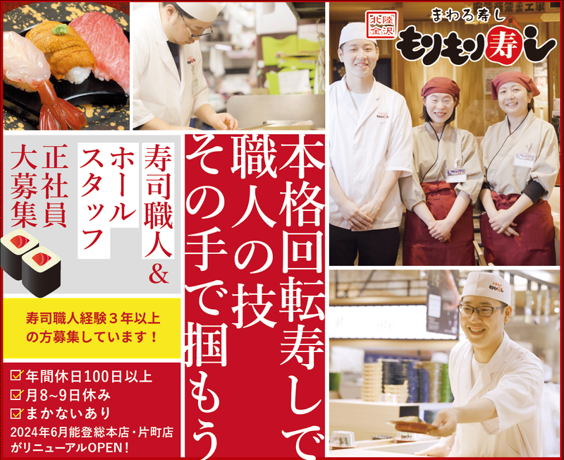 仕事内容 「一流の技術を学び、寿司職人として活躍するチャンス!」 世界が注目する日本の技を身につけませんか? 本場北陸の回転寿司の寿司職人として、 「限定1名」を採用します!! 今の職場には限界を感じている方や、 将来自分のお店を持ちたい方に最適! 理想を叶えるステージがここにあります! 「売上ノルマよりお客様満足を大事にしたい…」 「今の職場では成長が感じられない…」 「もっと将来性のある会社で働きたい…」 「自分の店を開く夢があるけど、経営の知識がない…」 「お客さんとのコミュニケーションが多い職場で働きたい」 そんな想いをお持ちの方は、 私たちもりもり寿しの門を、ぜひ叩いてください。 あなたの「挑戦したい」という気持ちを、 私たちは全力でサポートします。 あなたの技術をさらに磨き、理想を叶えるために、 ぜひ一緒に働きましょう! ❖ アピールポイントをご紹介!  ̄ ̄ ̄ ̄ ̄ ̄ ̄ ̄ ̄ ̄ ̄ ̄ ̄ ̄ ̄ ✅売上より「お客様の満足」が大事なので、売上ノルマなし ✅キャリアを積んでFC店の店長として独立もできる! ✅食費が浮く!まかないはごはんみそしる無料♪ さらにお寿司や一品料理など店内商品半額! ✅現時点でお客様との会話に自信がなくてもOK ✅選べる働き方⇒休みたい!稼ぎたい!両方叶えます 「新たな環境で技術をさらに高めたい!」 という意欲のある方と一緒に働きたいので、 今回は、寿司職人経験者の方のご応募をお待ちしております。 ぜひ、この機会をお見逃しなく、お気軽にご応募ください。 ───────────────── 世界がうらやむニッポンの技、 その手でつかもう ───────────────── ❖ 仕事内容は?  ̄ ̄ ̄ ̄ ̄ ̄ ̄ \お寿司屋さんの花形!寿司を握るお仕事です/ もりもり寿しで寿司職人として、魚をさばいて寿司を握って 提供するお仕事を主にお任せします! カウンター寿司や和食など飲食経験がある中途入社の方も多数。 お店自体、新人さんも馴染みやすい雰囲気で、 勤続15年以上の社員も多いんです!! 【具体的には…】 ・寿司を握る ・調理(魚をさばく) ・仕入れや仕込み ・在庫管理 ・店内清掃 ・メニュー開発 など ※経験を積んだキャリアアップの道には、店舗の店長や 仕入れ管理責任者といったキャリアがあります。 コツコツ現場で頑張っていた寿司職人が独立開業して、 FC店舗の社長として経営をおこなっている実績もあります! ❖ 入社から1人前になるまでロードマップ  ̄ ̄ ̄ ̄ ̄ ̄ ̄ ̄ ̄ ̄ ̄ ̄ ̄ ̄ ̄ ̄ ̄ ̄ \多くの寿司職人を育て上げた実績があります/ ▼握り経験のある方 入社後は調理場に入り、ネタ切りや仕込みの部分を 先輩社員の指導を受けながら学んでいただきます。 ネタ切りは、各ネタごとに、切り方や大きさに決まりが ありますので、実務を通して身に着けていただきます。 包丁の使い方やすしの握り方など熟練度を見て、 必要に応じて指導させていただきます。 1カ月程度でお客様の前で寿司を握れるようになりますよ! ❖ ”もりもり寿し”の寿司職人として働く魅力!  ̄ ̄ ̄ ̄ ̄ ̄ ̄ ̄ ̄ ̄ ̄ ̄ ̄ ̄ ̄ ̄ ̄ ̄ ̄ ̄ ̄ ✅[1] 大切なのは売上よりお客様満足。だから売上ノルマなし! 当社では、お客様の満足度を最優先に考え、売上ノルマを一切設けていません。 数字は社長がしっかり見るのでご安心を。 売上よりも社員のみんなに大事にしてほしいのは、お客様が美味しいお寿司に満足して「また来たい!」と思えるお店になること。 そのため、プレッシャーが少なく、のびのびした雰囲気で仕事ができる店舗が多いことが当社の特徴です! ✅[2] ファンを作るほどのコミュニケーション力がなくてもOK! 当社で活躍している方のほとんどがコミュニケーション力が高い方より、コツコツと真面目に働いてくれている方です。 もりもり寿しは店舗全体でのお客さま満足度を追及しているため、カウンター寿司のように「大将にお客さまがつく」のではなく「店にお客様がつく」というスタイルです。 そのためカウンター寿司と違い、お客様と上手にお話ができなくても問題ありません! もちろんコミュニケーションが得意な方は存分に活かして働けます!常連さんとの会話はやりがいにもなって楽しいですよ♪ ✅[3] 休みたい!稼ぎたい!両方叶います! 働き方やキャリアについては、みなさんのご希望を1番に考えた働き方をご提案できます。実際に以下の働き方をしているメンバーがいます! ◇お休み重視派→1日8時間で週休2日!趣味や家庭と両立! ◇稼ぎたい派→月4日休み8時間勤務(残業あり)で、月収は46万円!(※ご希望の条件によっては業務委託としての契約になる可能性もあります) ✅[4] キャリアを積んでフランチャイズ店舗の社長として独立することも可能! 現場の寿司職人としてずっとコツコツ頑張ってきたメンバーが、独立開業してフランチャイズ店舗の社長として経営をおこなっている実績もあります! 今後は会社としてもどんどん社員にフランチャイズ店舗を任せ、社長をたくさん増やしてい