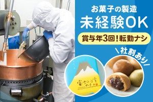 インフォメーション もくもくとした作業が好きな方におすすめ!作業場は空調完備で快適・キレイ!未経験からでもはじめられますよ! 当社は、羊羹の下請け製造から始まりました。 「一口富士山ようかん」や 「伊豆のあまんじゃく」「土井の田舎草もち」 などの自社開発によるヒット商品に恵まれ、 観光地へのお土産用のお菓子の製造、卸の 販路を拡充してきました。 創業以来培った技術と経験を活かし、お客様 により喜ばれる商品を作り、より喜ばれる 会社を目指すために、共に菓子の製造に 携わっていきませんか? アピールポイント ■地域に根付いて働くことができる ■「田舎暮らし」を始めたい方にもおすすめ で、安定したお仕事です! ■社歴や年齢に関係無く働くことができる ■安定した環境で長期的にキャリアを構築 したい方 ■退職金・賞与、昇給もあります! ■食品製造=女性が働くイメージがありますが、 男性スタッフも活躍していますよ! 慣れ親しんだ地元地域で働きたい方、 心機一転新たな環境で新しいことに挑戦 したいと、Uターン・Iターンをお考えの方に ピッタリのお仕事です。 又仕事もプライベートも両方充実させたいと お考えの方にもおすすめです。 ※この求人はオススメの求人です