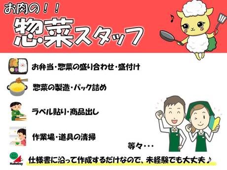 仕事内容 ☆お肉の惣菜(ミートデリカ)コーナーでの業務 メインのお仕事は、お弁当の製造、惣菜のパック詰め、品出しになります。 マニュアルに沿ってお弁当を作り盛り付け、ラベル貼りを行います。 マニュアルに沿って作業するだけなので、未経験でも大丈夫♪ 「自宅との距離が近いから働こうかな」「経験を生かして働きたい」働く理由は何でもOKです! 今活躍しているスタッフは、学生や主婦。みなさん、空き時間をうまく使って働いています。 いろいろな働き方ができるハローデイのスーパー店舗スタッフとして働いてみませんか? アルバイト・パート大募集です! 「スタッフが働きやすい店舗」「お客様が楽しくお買い物ができる店舗」がコンセプトになっています。 お子様連れの方から中高年・シニアの方まで、様々なお客様がご来店されます。 どなたでも楽しく便利にお買い物していただけるような工夫も、店舗スタッフのお仕事なんですよ。 また、安全性の確保・お客様の笑顔のため、楽しく美味しい商品を「新鮮に、安全に」お届けしています。 お客様とスタッフ、どちらも満足できるスーパーを目指しています。 未経験大歓迎!しっかり丁寧にサポートするので、不安な方もご安心下さい。 仕事の進め方は先輩スタッフが丁寧にお教えするのでご安心下さい。 スーパーでの店舗スタッフ経験のある方はもちろん、未経験の方も大歓迎! できることからスタートしましょう。 お子さんも大きくなり少し時間の余裕ができた主婦さんや授業の合間に働きたい学生さんなど、 スーパーでのお仕事経験が初めての方も多数活躍中です。