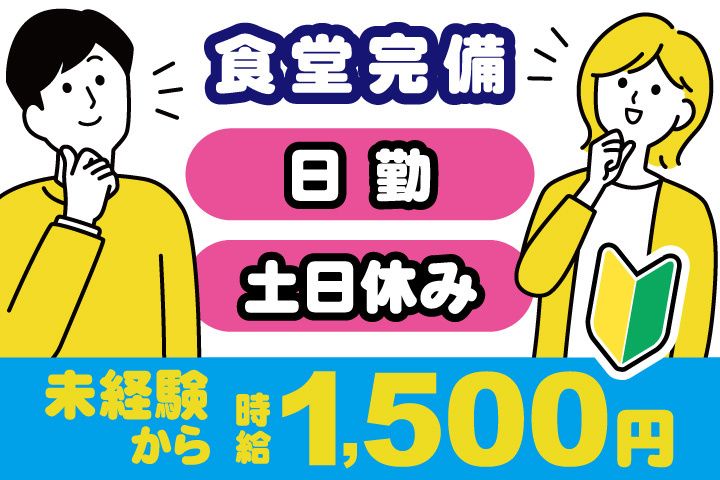 仕事内容 日勤・土日祝休みで未経験から高時給! 直接雇用の正社員に転籍の可能性あり!長期安定を目指す方にもオススメ! 20代・30代・40代・50代など若手から中高年の男性スタッフ活躍中! ▼この募集のポイント 〇時給1,500円~ 〇月収24万円以上可能 〇日勤&土日祝休み 〇無資格OK・製造未経験OK 〇チームで取り組むライン作業 〇中高年も活躍中 ▼簡単な組立・加工 自動化された最新のキレイな工場で快適カンタン軽作業! 工場内でピッキング・組立・マシンオペレーターなどをお任せします。 電気自動車用ドアパネルの組立のお仕事です。 他のスタッフと協力して作業にあたるライン作業だから安心スタート可能です! ▼未経験でも安心の研修制度あり 簡単な組立作業だから未経験でもOK! 社員からのOFFJT、OJTがあり安心してスタートできます。 ▼日勤・土日祝休み 日勤・土日祝休みで月収24万円以上可能! 安定収入もオンオフのメリハリも、どちらも叶えたい方にオススメ! ▼入社日相談可 先付スタート希望の方もお気軽にご相談ください。 すぐ働きたい方も歓迎!最短1~2週間で勤務スタートOKです。 長期安定を目指すあなたにもオススメ! 他にも、あなたにピッタリなお仕事がきっと見つかる! まずはお気軽に採用担当へご相談ください。