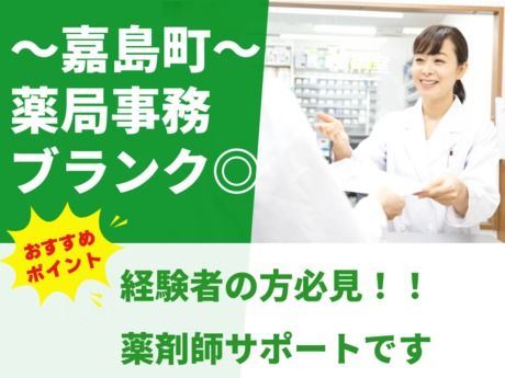 仕事内容 \ここがポイント/ ★調剤薬局事務経験者必須!ブランクOK♪ ★日曜・祝日休み+他の休みもあり! ★熊本県上益城郡嘉島町での調剤薬局事務業務! *・。・。*・。・。*・。・。* <仕事内容> \★ブランクOK!経験を活かして働ける調剤薬局事務のお仕事★/ 調剤薬局にて、事務業務全般を担当します。 ・処方箋の受付や入力業務 ・薬剤師のサポート、医薬品の在庫管理 ・患者様対応や電話応対 調剤薬局事務の経験がある方が対象です。ブランクがあってもOK!日曜・祝日休みで、働きやすい環境です。 *・。・。*・。・。*・。・。*