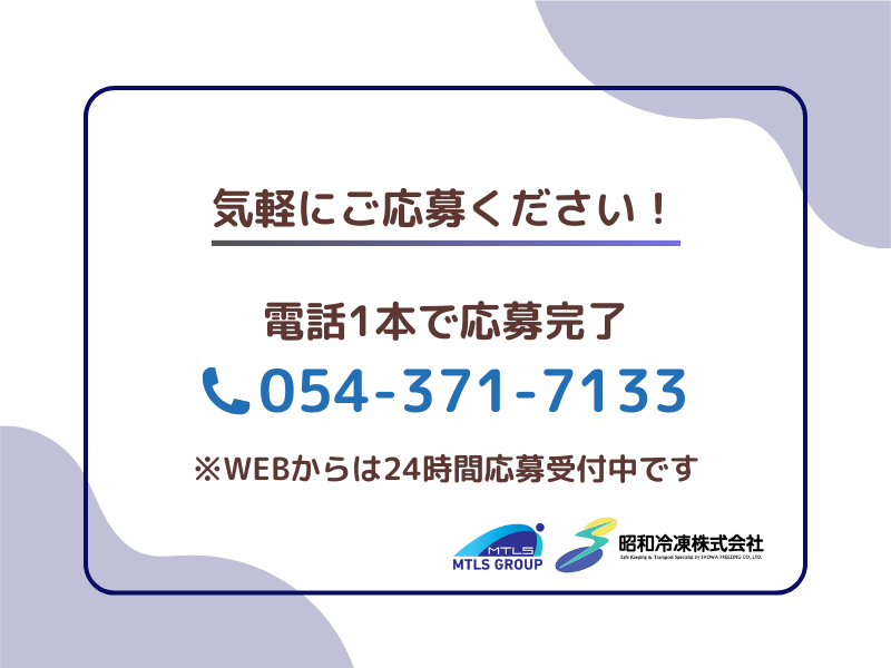 選考プロセス WEBまたは電話にてご応募ください。 WEBの場合は応募内容確認後に こちらからご連絡いたします。 電話の場合は「求人情報を見ました」と お伝えください。質問のみもOKです。 【選考の流れ】 1.応募 2.面接 3.入社 現在、他のお仕事をしている方も ぜひご応募ください。面接日や 入社時期はご相談に応じます。