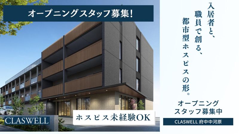 仕事内容 2025年12月オープン予定の「CLASWELL 府中中河原」で働く看護スタッフを募集します! 【住宅型有料老人ホーム(ホスピス)での看護師業務】 ご入居者様の健康管理全般(服薬管理・診療補助・経管栄養・吸引など) 診療補助 受診対応 各種記録 その他 ■施設情報について■ 開設 :2025年12月(予定) 種別 :住宅型有料老人ホーム(ホスピス) 施設名:CLASWELL府中中河原 定員 :47名(47室 全室個室) 最寄り:京王電鉄「中河原」駅、徒歩4分 ■職員配置について■ ホーム長: 1名 副ホーム長: 1名 生活相談員: 1名 理学療法士: 2名 言語聴覚士: 1名 ケアマネージャー: 2名 事務: 2.5名 (※常勤換算) 看護管理者: 1名 看護師: 25.5名 (予定 ※常勤換算) 介護管理者: 1名 サービス提供責任者: 2名 介護士: 28.5名 (予定 ※常勤換算) 用務員: 2.0名 (予定 ※常勤換算) 清掃員: 3.0名 (予定 ※常勤換算) ※ご入居者様の状況により変動あり ■業務配置について■ 看護職:日中(最大) : 9名 夜勤(最大) : 4名 介護職:日中(最大) : 13名 夜勤(最大) : 3名 ※ご入居者様の状況により変動あり