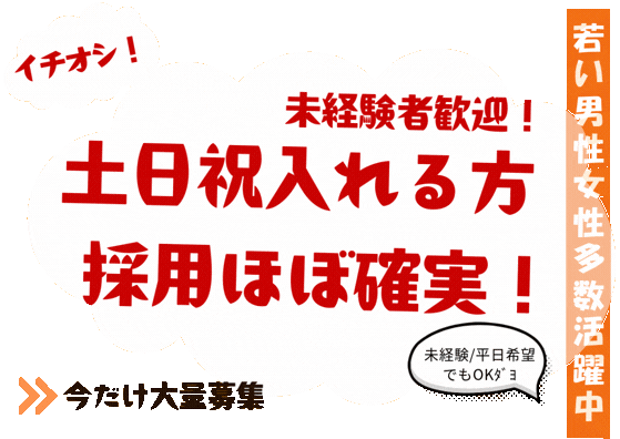 勤務時間詳細 < 8:00-19:00内 > ・週3日~OK ・1日5時間~OK ★フルタイムも大歓迎! ★土日祝勤務できる方積極採用中!