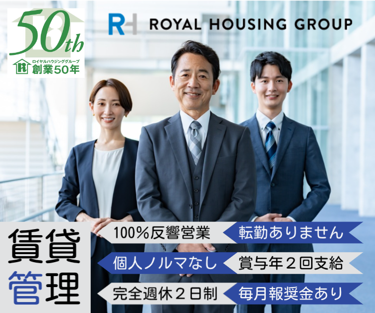 仕事内容 ❖ポイントをサクっと紹介! ✅ 完全週休2日(ローテーション制) ✅ 転勤なし。現在住んでいるところ無理なく通えます。 定員になり次第、募集締め切りいたします。 ぜひ、この機会をお見逃しなく、お気軽にご応募くださいね。 ==================== <店舗の“顔”として明るいサポート対応を> ★頑張りには賞与、報奨金にてしっかりお応えします! 〈仕事内容〉 ◎オーナー様対応 ◎賃貸退去精算対応 ◎電話・来客応対フォロー ◎自社HP・ポータルサイト更新 ◎書類整理・管理スタッフフォロー ◎売上集計書類作成・管理等 <こんな方を求めています> 明るく前向きな方 長く、安定して働ける環境を探している方 対外的なコミュニケーションに長けている方 お店の売上が大きく変動する裁量のあるポジションです。 <先輩がやさしくフォロー> 各店舗には5名~約50名程度のスタッフが在籍。 風通しも良く、面倒見の良い先輩ばかりなので 困ったときは気軽に相談できます。 約3ケ月の丁寧な研修を用意しています。 不動産賃貸仲介部署や、売買事業部とも連携して運用します。 <社内は落ち着いた雰囲気> 不動産というと体育会系のイメージを持たれがちですが、 物静かな社員が多く落ち着いた環境です。 挨拶する、分からないことがあったら聞く、といった 一般的なコミュニケーションスキルがあれば歓迎します。 <他社との違いと自社の強み> 創業50年の歴史から、グループの管理戸数は1万戸 オーナー様から区分所有が3割:一棟タイプが7割に及ぶ賃貸物件を受託しています。 仲介件数も、首都圏では30位以内に毎年入っています。 また、賃貸管理物件の入居率は9割を超える高実績です。 賃貸物件の管理のみを行う一般的な管理会社とは一線を画し、 オーナー様の収益の最大化を図るため、さまざまな視点からご提案を行えます。 物件の管理業務はもちろん、不動産経営のためのご提案、また相続に関するご相談など、多岐に渡ってサポートします。 ==================== ロイヤルグループについて  ̄ ̄V ̄ ̄ ̄ ̄ ̄ ̄ ̄ ̄ ̄ ̄ 1975年創業、不動産仲介ひと筋に事業を 展開。多くの実績を重ね、まさまざまな 社会貢献により企業としての責任を果たしてきました。 当社のもっとも大きな特徴は、 一人暮らしの住宅からファミリー向け住宅、 リゾート仲介に高齢者の住まいまで、 人の一生のあらゆるステージに必要な 「住まい」すべてに関わるサービスを ワンストップで行なっているということです。 一人のお客様と長くお付き合いすることも あり、そこにやりがいも生まれます。