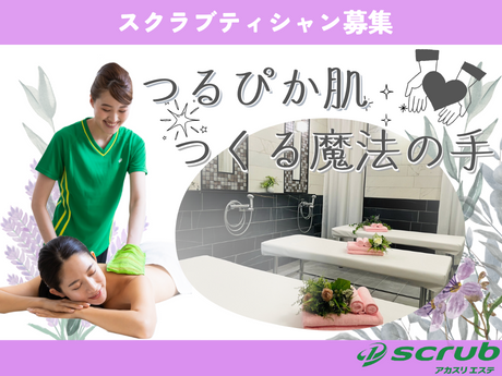 お仕事内容 ◆スクラブエステサロンでの施術・接客を担当していただきます。 具体的には… ◇予約受付/ご案内 ◇カウンセリング ◇ご要望に応じた施術 ・スクラブ(アカスリ) ・アロマリンパトリートメント ・海藻ジェルトリートメント ・フェイストリートメント ・顔ピーリング ・顔パック ・ヘッドリフレ ・デコルテリンパ *未経験の方でも安心の研修制度* 業界屈指の研修専門施設で、『結果の出せる技術』を丁寧にレクチャーします。 験者の方はこれまでのスキルを更に磨くことができるため、スキルの幅が広がります! 経験豊富な講師陣が、熱意を持ってイチから全て伝授します!