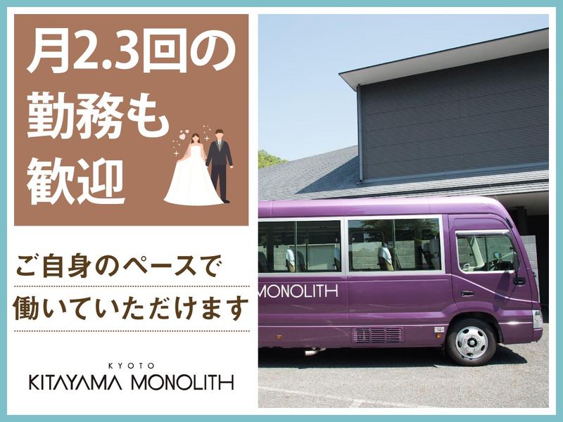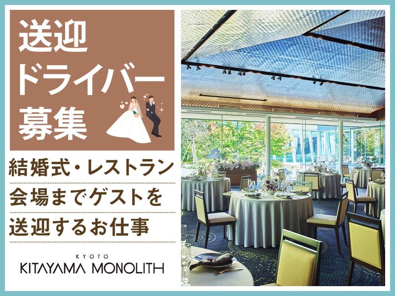 仕事内容 ★月1回・1日4H~から勤務可能! ★60代・70代の応募も大歓迎♪ ★長時間の運転はなし!待機時間多め◎ - <主なお仕事内容は…> 結婚式場「北山モノリス」 およびレストランまで、 弊社所有の28人乗りマイクロバス(AT車) でお客様を送迎するお仕事です! 地下鉄「松ケ崎駅」から会場まで 約1kmの距離を片道5〜8分程度で運行します。 結婚式や宴会に参加されるゲストの送迎がメイン業務です♪ <1日の流れ> ◆午前に結婚式がある場合 ・8時〜11時:駅から会場までピストン送迎 ・式中は待機(自由時間/時給発生) ・14時半〜15時半:ゲストを駅まで送り届けて業務終了 ◆午後に結婚式がある場合 ・14時~16時:駅から会場までピストン送迎 ・式中は待機(自由時間/時給発生) ・19時半〜22半:ゲストを駅まで送迎し退勤 【ポイント】 ◎自由時間あり!式の待機中も時給が発生します♪ ◎ピストン送迎なので長距離運転なし! ◎待機中はバスで待機や自宅に戻っての待機もOK! ―――――――――――――――― オススメポイントはこちら★★ ―――――――――――――――― ■月1日から勤務OK! 予定に合わせてシフト調整できます ■運転がメイン業務なので特別な力仕事はありません◎ ■免許を活かして働ける! 現在60代の男性スタッフが活躍中◎ 未経験でも長期勤務中の先輩スタッフがしっかりサポートします! ■マイクロバスはオートマチック車を使用! ■嬉しい社員割引あり 名店揃いの全国自社レストランも、全店が割引♪ ―――――――――――――――― 北山モノリスについて★★ ―――――――――――――――― 京都府、北山の閑静な 住宅街に佇む北山モノリス。 季節ごとに表情を変える日本庭園を中心に、 上質な空間で結婚式とレストランのおもてなしを叶えます。 参列するお子様やご親戚まで幅広い世代の 方々の「幸福感」「笑顔」「祝福」があふれるお仕事です★