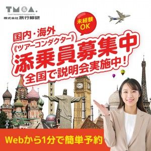 仕事内容 ★国内・海外ツアーコンダクター(旅行添乗員)募集 広島空港や広島駅他より出発する国内団体旅行に同行し、 お客様が楽しく安全に旅の時間を過ごせるよう配慮や管理をする仕事です。 ほぼ全員が未経験からスタートしています。 しっかりした研修がありますので未経験の方も安心です。 希望者は、一定の国内添乗を経験したのち、 大阪、東京発着の海外ツアーを担当いただくことも可能です。 具体的な仕事例 (国内ツアーの場合) ・お客さまの人数管理、お荷物数の管理 ・旅行中の日程や予約の確認 ・旅程や観光についての案内や誘導(ガイド業務ではありません) ー★ポイントー それぞれのお客さまが安心して 楽しい時間が過ごせるよう 心遣いを行うことが大切です。 はじめは覚えることが多いですが、 やる気のある方は、 プロのツアーコンダクターとして 活躍できるよう指導します。 無理のない、力量等にあったお仕事 からご紹介します。 \事務やオフィスワークでは味わえない様々な経験ができます♪/ 希望者は国内業務経験後、海外をめざしていただけます。 [醍醐味] オフィスのルーティンワークに飽きた! 自分のペースで仕事がしたい! 会社の人間関係が嫌だ! 日本や世界で見聞を広めて様々な経験をしたい! 語学を生かした仕事をしたい! そんな方にはぴったりの仕事です。 お気軽に説明会へご参加ください。 [こんな人が活躍] ツアーコンダクターの仕事はサービス業務です。 多くの人と円滑なコミュニケーションがとれる方に向いています。 説明することが多い仕事ですから、ハッキリと大きな声で話ができることもポイントです。