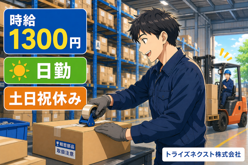 ■仕事内容 ▼▽▼▽▼▽▼▽▼▽▼▽▼▽▼▽▼▽ 精密部品の入出荷作業スタッフ募集!! ▲△▲△▲△▲△▲△▲△▲△▲△▲△ 精密部品を扱う倉庫内でのお仕事です。 出荷梱包作業および出荷に関連する軽作業をお任せします。 荷物の運搬など体力を要する作業が含まれます。 ※フォークリフト資格をお持ちの方大歓迎!! (フォークリフト資格なしでもご応募可能です♪) 作業内容はシンプルで分かりやすく、先輩スタッフが丁寧に教えてくれるので、 未経験の方やブランクがある方も安心してスタートできます。 少しでも気になった方は、まずはご相談だけでもOK! 職場見学も可能なので、実際の雰囲気を見てから決められます♪ その他お仕事情報も多数☆ 弊社ホームページから検索可能♪ ↓ ↓ ↓ ↓ ↓ ↓ ↓ https://trys-next.co.jp ■仕事の特徴 駅チカ・駅ナカ 車通勤OK バイク通勤OK 友達と応募OK 即日勤務OK フルタイム歓迎 長期歓迎 平日のみOK 学歴不問 未経験・初心者OK ブランクOK 経験者・有資格者歓迎 中高年応援 資格不問