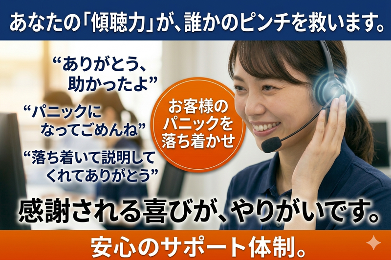仕事内容 保険事故や住宅トラブルなどの 受付対応を行うコールセンター業務です。 お客様からのご連絡を受け、 内容をヒアリングし、適切な対応へつなぐお仕事です。 人の役に立てる、やりがいのあるポジションです。 ■ 具体的な業務内容 ・保険事故の対応(ロードサービスなど) ・住宅設備トラブルの受付対応 ・タクシーに関するお問い合わせ対応 ・レンタル倉庫のカスタマーサポート ・時間外窓口の受付対応 ※複数の案件を担当しますが、 難易度の低い業務からスタートします。 ■ 業務の流れ ・お客様からのお問い合わせ対応(受電) ・内容のヒアリング ・専用システムへの入力 ・関係部署への引き継ぎ PCは1台で対応。 マニュアルに沿って進めるため安心です。 ■ この仕事の特徴 ・未経験からスタート可能 ・社会貢献性の高い仕事 ・傾聴力が活かせる ・クレーム対応経験が活かせる ・落ち着いた対応が求められる業務 ■ 研修について ・初日:座学研修(2~3時間) ・その後:OJT研修 段階的に業務を習得できる環境です。