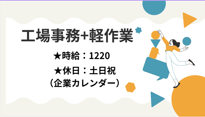 仕事内容 工場内での事務作業+軽作業をおまかせ! モノづくりを支える、やりがいたっぷりのお仕事です♪ ・生産スケジュールの作成・調整 ・工程の進み具合をチェック! ・データ入力や書類作成 ・電話・メール対応 ・梱包・運搬・検査などの軽作業サポート♪ ☆軽作業+デスクワーク☆ 動きのあるお仕事も、PC作業もしたい方、必見です! 【お仕事No.】369129 【アピールポイント】 ◆事務×軽作業のいいとこ取り! → デスクワークだけじゃ物足りない…そんなあなたにピッタリ!体も動かせて気分もリフレッシュ♪ ◆土日祝休み+長期休暇あり! → 年末年始・GW・お盆など、しっかりお休みが取れるから、旅行や趣味の時間もたっぷり確保できます♪ ◆安定して長く働ける環境! → 長期で働きたい方にうれしい、落ち着いた職場です◎ *【期間】即日~長期(3ヶ月毎更新) *※開始日のご希望がある方は 別途ご相談ください☆* 【当社について】 キャリアステーションは、 地域密着型の総合人材サービス企業です。 30年以上の派遣実績で、 地元を知り尽くした人材派遣会社、 安心の広済堂ホールディングス (東証プライム上場)のグループ企業です。