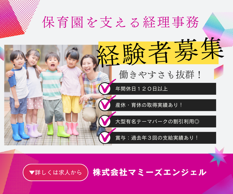 仕事内容 ✨マミーズエンジェルの想い 日本は「超高齢社会」を迎え、 高齢者向けのサービスは年々 充実してきています。一方で、 その未来を支える子どもたちや、 子育てをするご家庭への支援は、 まだ十分とは言えません。 マミーズエンジェルは、 「子どもたち」と 「保護者の皆さま」 を真ん中に置いた保育を 大切にしています。 0〜5歳という 「人生で最も大切な時期」に、 子どもたちがのびのびと、 たっぷりの愛情の中で、 一人ひとりの個性と感性を 伸ばしていける環境をつくること。 そして、保護者の皆さまが 安心して子どもを預け、働き、 子育てできる社会づくりに貢献すること。 それが私たちの使命です。 代表自身も、5人(うち3つ子)の 親として子育ての大変さと 喜びを経験してきました。 その実感と決意を軸に、 子どもたち・保護者・地域社会と 手を取り合いながら、 保育事業を広げています。 ✨私たちの「真心保育」 私たちの保育の原点は、 「真心保育」です。 ✅子ども一人ひとりのいのちと 人格を最優先に考える ✅子どもの目線に立ち、 その子の心を受け止める ✅子ども自身が「自分は愛されている」 と感じられる関わりを大切にする このような深い信頼関係の上に、 ✅しつけ教育 ✅情操教育 ✅基礎教育 ✅専門教育 を、子どもの成長に合わせて 丁寧に積み重ねていきます。 また、乳幼児教育の専門家(大学教授や 幼稚園園長など)の先生方から 継続的にご指導をいただき、 一方に偏らない、バランスのとれた 保育・教育を心がけています。 ✨大切にしている5つの育ち 私たちは、次の5つの育ちを 大切にしています。 ✅心身ともに健やかな育ち ✅一人ひとりの個性・特性を伸ばし、 弱さを支えること ✅「ありがとう」と言える感謝の心 ✅いのちの尊さへの深い理解 ✅社会性・協調性を身につけること これは保育園の中だけで 完結するものではありません。 保育士・園児・保護者が三位一体 となり、同じ想いを共有しながら 育んでいくものだと考えています。 そのため、私たちは保護者の皆さまとの 対話や連携をとても大切にしています。 ✨こんな方と一緒に働きたいです ✅子どもの心の声をていねいに 受け止めたい方 ✅目の前の子ども一人ひとりと、 じっくり向き合う保育がしたい方 ✅保護者や地域と協力しながら、 子育てを支える仕事に やりがいを感じる方 ✅専門家から学び続け、 自分の保育も成長させていきたい方 ✅いのちと人格を尊重する保育理念に 共感してくださる方 私たちの理念に共感し、「真心保育」 を一緒につくってくださる仲間を お待ちしています。 子どもたちと保護者の皆さま、 そして地域の未来のために、 共に歩んでいきましょう。 ー仕事の特徴・PRー ✨業界経験・知識は不問! ✨経理経験を活かす経理募集! ✅大型有名テーマパーク割引や 野球観戦チケットあり◎ ✅年間休日123日 ✅週休3日制の選択も可能! ✅残業少なめ(月平均20時間以内) ✨具体的な仕事内容 ―――――――――― ・仕訳データ入力 ・入金確認業務 ・出納帳管理 ・月次、年次決算業務 ・税理士対応 ・社会福祉法人会計(一部) ・保育園監査対応 ・総務業務 ・給与計算補助 など ✨ブランクのある方も歓迎! ―――――――――――――― 入社後は、あなたの得意な業務から 担当していただきます。 保育業界ならではの 仕事内容や専門知識については 先輩とのOJTで少しずつ覚えていけるので ご安心くださいね。 子育て世代のママさんも多数在籍! 「子どもが小学生になったタイミングで もう一度【経理】で働きたい!」 そんなブランクがある方も歓迎します♪ ポジションは経理事務ですが、 各園に訪問しての業務もあるので、 様々な知識やスキルが身に付きますよ! ✨今までの経験・スキルを活かしながら キャリアアップ! ――――――――――――――――――― 年3回の社員総会では、 自己評価書に「頑張ったこと」 「今後取り組みたいこと」を記載して 社長に直接提出。 社長との距離が近いからこそ、 日頃の努力をしっかり見て、 評価してもらえるだけではなく、 あなたの「やってみたい」という意欲も サポートできるんです。 大きなやりがいを感じながら、 理想のキャリアを築ける環境です。 ✨子どもたちと先生の毎日を支えながら あなた自身も成長できる! ――――――――――――――――――― 当社は2002年の設立以来、 『日本で一番、保護者に選ばれる保育園』 を目指して順調に事業を拡大中。 現在は東京と横浜に16か所の 認可・認証保育園を展開しています。 今回は、子どもたちや保育士さんが 安心して成長できる環境を支える 本部スタッフを募集。 経理・財務や総務事務といった経験を 活かせるのはもちろん 「子どもが好き!」 「保育業界を支えたい!」 という想いのある方は大歓迎! 必要な業界知識や用語は、 全て入社後に習得できるので、 ご安心ください。 各施設と本社を結ぶ架け橋的存在として、 子どもたちや職員の方々を支えられる