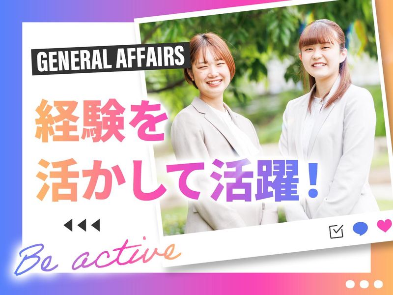 求めている人材 \✨経験者募集・20代・30代が多数活躍中!✨/ バックオフィスのコアメンバーとして これまでの経験を存分に活かし、 会社を支える重要な役割を 担っていただきます。 あなたのスキルと知識を活かして 更なる成長を一緒に実現しましょう! 【 必須 】 ✅総務・労務・経理業務の いずれかの実務経験がある方 ✅PCの基本操作(Excel・Wordなど) 【 こんな方にピッタリ 】 ✅前職での経験・スキルを発揮したい方 ✅積極的に学び、成長意欲がある方 ✅人とのコミュニケーションが好きな方 ✅チームワークを大切にできる方 ✅プライベートの時間も充実させたい方 ✅頑張った分、しっかり評価されたい方 …など =…=…=…=…=…= 社歴や年齢に関係なく、 社員同士でのコミュニケーションも盛ん♪ 明るくフラットな雰囲気の職場なので、 新人さんも きっと馴染みやすいはず⭐