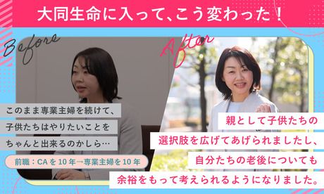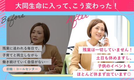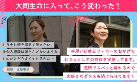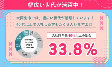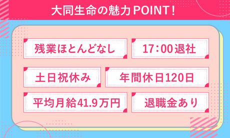 職場環境 【従業員構成】 当社社員の入社時の平均年齢は【34.5歳】(2023年度) 自分自身の新しい人生を歩みたい方を大同生命は応援します! 「家庭に専念していたが復職したい」 「子育てと両立し働きたい」 などの理由で入社される主婦・子育てママさんが多数います。 【この仕事を通して身に付くこと】 「働きやすさ」「長く勤めている女性の多さ」「年齢不問」という点に魅かれて入社した人が多数! 未経験でも活躍できている理由は、研修制度にあります。 ビジネスマナーや税務、マネジメントなど、年次・役職に応じて種類豊富にご用意。さらに、PCで視聴できるなど、個々人の必要に応じて学べる環境を整えています。 また、資格取得も推奨。「ファイナンシャル・プランニング技能士」3級はプランナーの6割が取得済です。