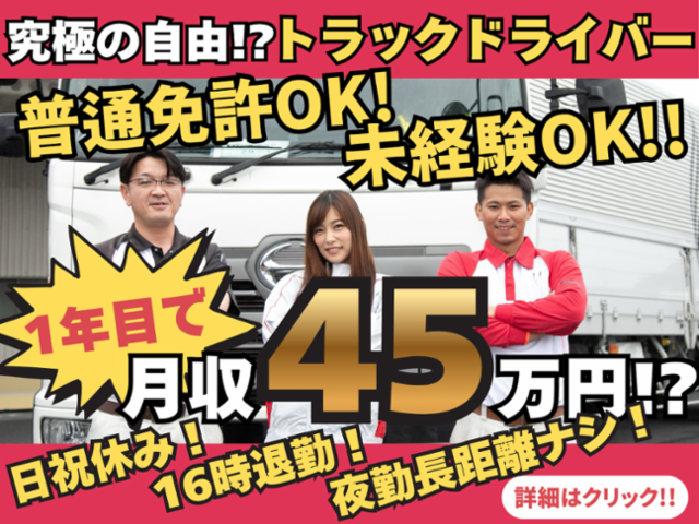 アピールメッセージ ✅普通免許&業界未経験OK✅1年目月収45万円以上狙える✅日祝休み✅16時退社で夜勤なし ドライバー必見!寮空室有り、免許取得支援や給与加算制度が充実。大手物流企業で新キャリアを始めませんか?<未経験歓迎>