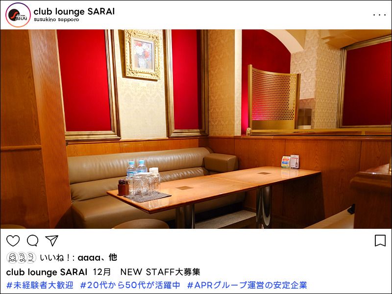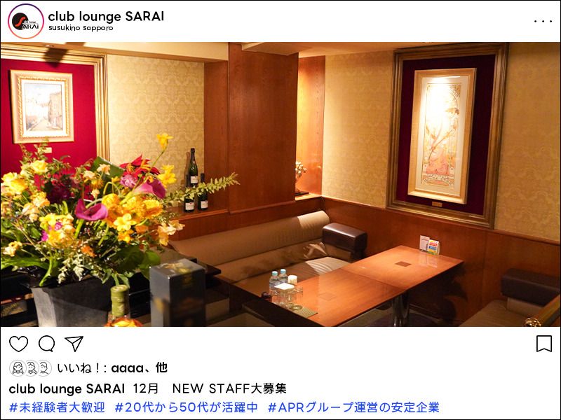 メッセージ すすきので40年、長年愛され続ける クラブラウンジ、サライのキャスト募集♪ 店内はレトロな雰囲気が漂い、ピアノの 生演奏が心地よく流れる落ち着いた空間です◎ 一見、”敷居が高そう”と思われがちですが、 実際はとてもアットホームで和やかな雰囲気! 2人のママがいる、安心空間♪ 気さくで面倒見の良い先輩ばかりです♪ 久々のおしごと復帰や、経験者さん...収入UP目指せる大手グループのクラブラウンジで働いてみませんか? クラブラウンジ運営