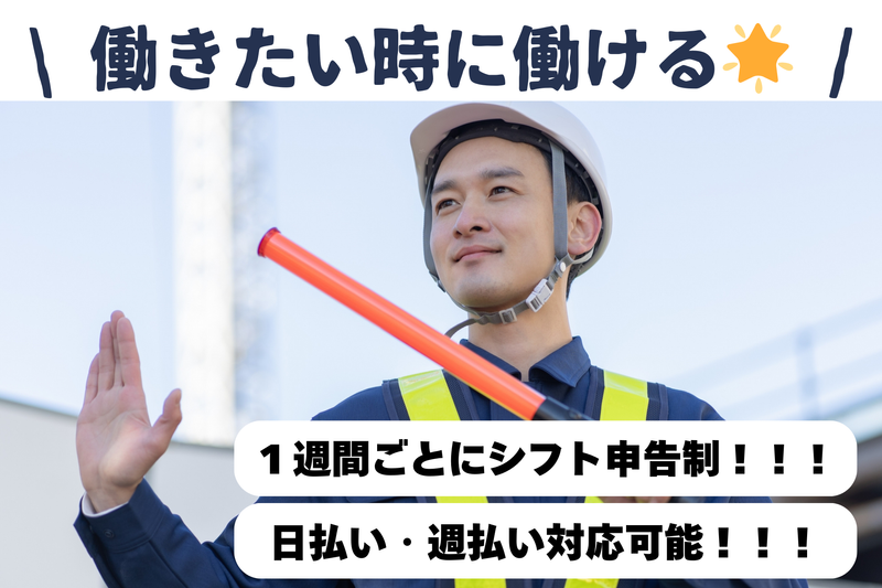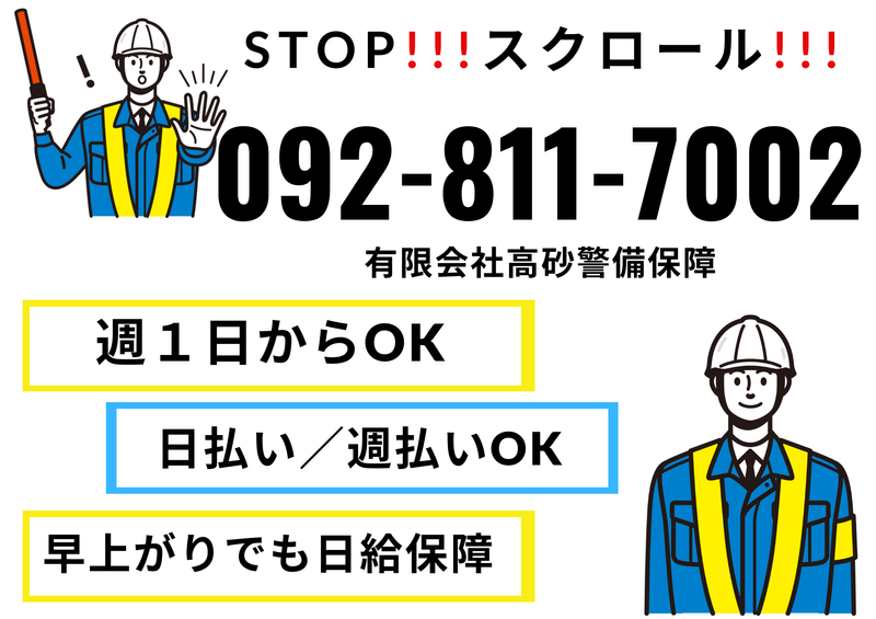 仕事内容 ――――⭐求人のPOINT⭐―――― ✅早上がりでも日給保障 ✅週1日~勤務OK、副業OK ✅日払い・週払い可能 ✅直行直帰OK!日勤のみ! ✅短期勤務もOK! ⭐―――――――――――――――――⭐ \\働きたい時に働ける!// 毎日どこかの現場が稼働しているので、 入りたい時に働くことが可能です♪ 1週間ごとにシフト希望申告制だから 予定が組みやすいですよ!!! ◎気になったらご連絡を!! 「詳細を聞きたい!」だけでも大丈夫です! >>☎092-811-7002 >>出張面接もOK♪ ⭐―――――――――――――――――⭐ スポーツ大会会場や建築現場、 公共工事等での交通誘導をおまかせします! 事前研修もあり、複数名で勤務を行うので、 未経験の方もご安心ください! もちろん経験がある方も大歓迎! ご応募お待ちしております!! ⭐―――――――――――――――――⭐ 【時間】8:00~17:00 ◆週6日勤務は+2000円の特別手当有り! 「2000円/週」を週6日勤務した週に支給 ◆4.5h以上の勤務で日給保障有り! ⭐―――――――――――――――――⭐ 「自分に警備ができるか不安」 そんな方、まずは短期で勤務しませんか? 「他の会社でも少しだけWワークしたい」 そんな勤務スタイルもOK ⭐―――――――――――――――――⭐ 直行直帰もOKです! マイカーの利用、公共交通機関どちらでも 交通費は規定支給あり! ⭐―――――――――――――――――⭐ ◎気になったらご連絡を!! 「詳細を聞きたい!」だけでも大丈夫です! >>☎092-811-7002 >>出張面接もOK♪