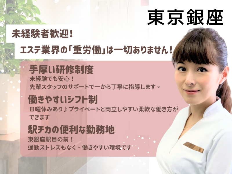 求めている人材 【エステティシャンとしての技術をお持ちの方】 弊店は痩身や全身マッサージなど、技術者が疲弊する施術は一切ありません。 お顔への施術と脱毛全般のみ。だから長く続けられます。 経験者:実務経験がある方。現職よりも給与UP約束します。ご相談ください。 【35歳以上の落ち着いた方】 お客様もスタッフも年齢層が高めのため、人生経験を活かしたきめ細やかな対応ができる方を歓迎します。 【お客様の美と心を深く理解できる方】 施術だけでなく、お客様の悩みや希望に真摯に耳を傾け、最適な提案ができるホスピタリティの高い方。 【チームワークを大切にし、協調性のある方】 スタッフ同士が尊重し合い、協力しながらより良いサロンを創っていける方を求めています。 【安定した環境で長く働きたい方】 キャリアをさらに深化させたい、プロとして活躍し続けたいという方を歓迎します。 GINZA Bonnyは、あなたの経験と技術を活かし、お客様を美しく、そして幸せにできる場所です。 落ち着いた空間で、大人の女性が活躍できる環境をご用意しています。 お客様を笑顔にし、あなた自身も輝ける場所がここにあります。 ご応募を心よりお待ちしております。