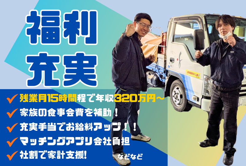 仕事内容 ✨「数字じゃなくて関係づくりを 大切にお客様と接したい」 ✨「提案で“ありがとう”が返ってくる 仕事に惹かれる」 ✨「お酒や飲食に興味がある、 それも活かしたい!」 どれか一つでも当てはまったら歓迎! ✅1日30件ほど固定ルート配送&商品案内 ✅ノルマなしで提案も気楽にできる♪ ✅賞与・決算賞与ありで収入も安定◎ ✅未経験からでも安心の育成体制あり ================== 普通免許(AT限定可)でOK! お気軽にご応募・お問い合わせください◎ ================== <具体的なお仕事は…> 飲食店やホテルなど、 既に取引のあるお客様へ 商品をお届けするルート配送業務です。 お届けと一緒に新商品やキャンペーンの ご案内や提案も行います。 運転するのは1.5トントラックで、 1日の配送は10~15件ほど。 毎回同じルートのため、 道もすぐに覚えられます。 注文票作成などの事務作業は少なく、 提案業務も「ノルマなし」だから安心です。 <1日の流れ> ▼出社。 ▼午前に配達する注文リストを確認し、 必要な商品をトラックに積み込む。 ▼午前の配達へ出発。 ▼会社に戻り、午後に配達する注文リストを 確認。必要な商品をトラックに積み込む。 ▼午後の配送へ出発。 ▼会社に戻り次第、片付けをして退社。 ー ⭐【配送未経験でも安心の育成体制】 入社後1〜2ヶ月は、先輩が運転する車に 同乗しての研修からスタート。 運転に自信がない方でも、教習や練習を経て 一人立ちできるのでご安心ください。 配送が慣れてきたら、キャンペーンの案内に 入っていくなど、一つずつ進めていきます。 お客様の顔と名前を覚えるところから ゆっくり慣れていきましょう。 ー ⭐【関係性を築く提案スタイル】 お届け先は飲食店やホテルなど、 長年の取引があるお客様が中心。 「いつもの◯◯さん」と覚えてもらえて、 ちょっとした世間話が弾むことも◎ 「この商品、お客さんに合いそうだな」 と始まった自然な会話が、 そのまま提案になり、信頼につながる。 そんな自分らしさが活かせる環境です。 ー ⭐【日勤のみ×週休2日】 夜勤や深夜勤務は一切なく、日曜・祝日は固定休。 有給休暇も取りやすく、年末年始や 夏季の長期休暇も取得可能です。 残業も月平均15時間ほどなので、 趣味や家族との時間も大切にできます。 ー ⭐【福利厚生の安心感】 創業129年の老舗企業で、安定感は抜群。 賞与年2回と業績により決算賞与もあり、 住宅手当・家族手当・資格手当など 各種手当も整っています。 結婚式費用補助や誕生日・記念日の 食事代補助、社員食堂・社割など、 ユニークな制度もたくさん。 社員旅行やイベントなどもあり、 楽しみながら働ける職場です。 ================== 飲食や営業など、異職種から転職してきた 先輩も多く活躍中です。 「先輩が気さくで、すぐ馴染めた」 「家族との時間や生活に余裕ができた」 「人と関わるところにやりがいを感じる」 など、数字では伝えきれない“働きやすさ”を 体感してもらえる職場です。 半日のお仕事体験も大歓迎! 少しでも気になったらお気軽にご応募ください。