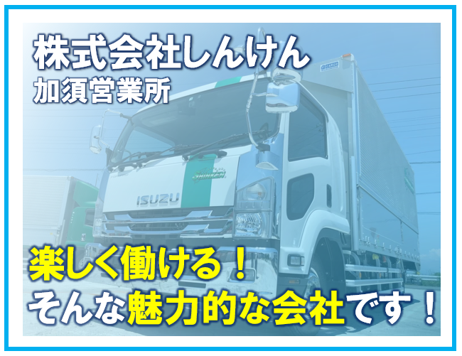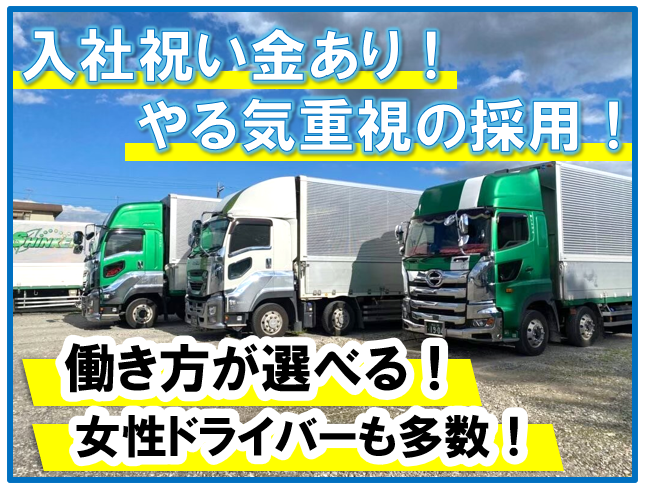 仕事内容 __________________  ̄ ̄ ̄ ̄ ̄ ̄ ̄ ̄ ̄ ̄ ̄ ̄ ̄ ̄ ̄ ̄ ̄ ̄ ✨✨ ドライバーさん大募集中 ✨✨ 入社祝い金・資格取得支援制度あり♪ __________________  ̄ ̄ V ̄ ̄ ̄ ̄ ̄ ̄ ̄ ̄ ̄ ̄ ̄ ̄ ̄ ̄ ̄ <主な仕事内容>  ̄ ̄ ̄ ̄ ̄ ̄ ̄ ̄ ̄ ̄ ̄ ̄ ̄ ̄ ̄ ̄ ̄ ̄ ̄ ✅フリー便 or 定期便で お客様の元へ荷物を届けていただきます! 【働き方が選べるんです!】 ⭐柔軟な対応力がつく " フリー便 " ================= ∟配送先が様々で飽きない! ⭐安定したルートで働ける " 定期便 " ================= ∟決まったルート・顧客だから安心! あなたに合った働き方で 楽しく快適に働ける環境です! 中型免許があれば未経験でもOK! 新卒や第二新卒、 フリーターさん・ブランクがある方も ぜひご応募ください! サポート体制はばっちりです! ドライバーと聞くと 「労働時間が長いイメージ・・・」 「長時間拘束は・・・」 そんな方が多いと思います! 当社は労働時間をしっかり管理しています! 1日実働8時間! 無理な運行や長時間労働はさせません! 働いてくれている従業員が 安心して勤務できる環境を作っています! =================== ✨ しんけんのオススメPOINT ✨ =================== ✔入社祝い金合計8万円あり! 入社3ヵ月で3万円・6ヶ月で5万円! ✔資格取得支援制度があります! けん引免許や大型免許なども取れます! ✔会社で労働時間をしっかり管理! 無理な働き方はさせません! ✔歩合給・評価給あります! 頑張りがしっかり返ってくる! ✔採用はやる気重視! やる気がある方大歓迎です! ✔男女関係なく活躍中! 女性ドライバーも多数♪ .。.:.。.:.。..。.:.。.:.。.:.。..。.:.。.:.。.:.。..:.。. \スキルアップを応援します!/ ■資格を取得してスキルUPしたい方を 応援します! こんな免許・資格を 会社負担で取得可能なんです! ✔大型免許 ✔整備管理士 ✔運行管理者 ✔けん引免許 ✔安全衛生管理者 など ※回数制限あり .。.:.。.:.。..。.:.。.:.。.:.。..。.:.。.:.。.:.。..:.。.