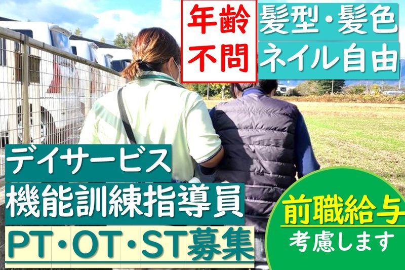 【アピールポイント】 デイサービスにて機能訓練指導員を募集します!! ■年齢不問 ■未経験OK ■ブランクOK ■なんと昼食無料 ■髪型、髪色自由 ■育休明けの職員多数在籍 ■体験入社制度あり(給与支給) ■キャリアアップ実績多数あり ■ネイルやアクセサリーOK(業務に支障のない範囲)