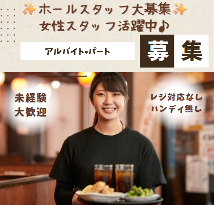 求めている人材 ✅必須 18歳以上・例外事由2号(労働基準法第61条・22時以降の勤務があるため) ☆未経験歓迎 ☆学生さん活躍中♪ ☆WワークOK ☆フリーター歓迎 ☆女性スタッフ活躍中!! もちろん、即戦力として飲食経験者の方も大歓迎です! <こんな方にもオススメ> ◎学業と両立したい学生さん ◎他のお仕事と両立したい方 ◎人と接することが好きな方 ◎美味しいまかないを食べたい方 年齢の条件と理由:あり(18歳以上・例外事由2号(労働基準法第61条・22時以降の勤務があるため))