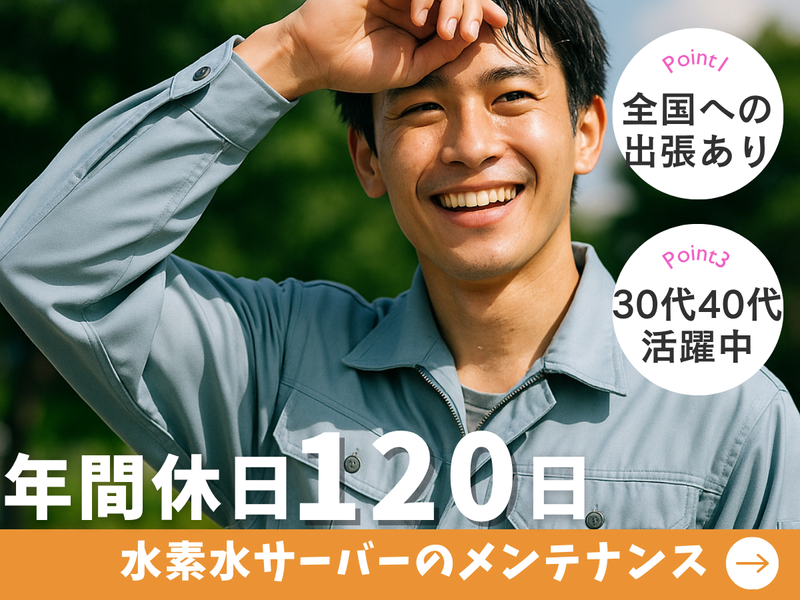 仕事内容 \✨新しい挑戦を始めよう✨/ 未経験から月給29万円スタート! 夜勤なし×完全週休2日でプライベート充実 30代・40代スタッフが活躍中! 全国のフィットネスクラブなどで 使われている業務用水素水サーバーの 【メンテナンススタッフ】を募集! ◆おすすめポイント◆ ✅営業活動やノルマなし ✅全国出張あり!新しい土地も楽しめる ✅月給27万円〜35万円+賞与あり ✅年間休日120日/趣味や旅行も充実 ✅30代40代活躍中! 【具体的なお仕事】 業務用水素水サーバーの設置・点検・修理を担当 ◎設置や入替時の日程調整 ◎部品交換・定期メンテナンス ◎お客様からの問合せ対応 ◎保守スケジュールの管理 ★夜勤なし!プライベートも充実 ★全国出張あり!新しい土地を楽しめる ★チームで協力しながら進めるので安心 ――――――――――――――――――― ⭐入社後は… 先輩がマンツーマンでしっかりサポート! 同行研修で流れを学び、 少しずつスキルを身につけられます。 ⭐キャリアパス チームを引っ張るリーダーや、 専門スキルを磨くエキスパートなど、 将来のキャリアを自分で描けます。 ―――――――――――――――――――