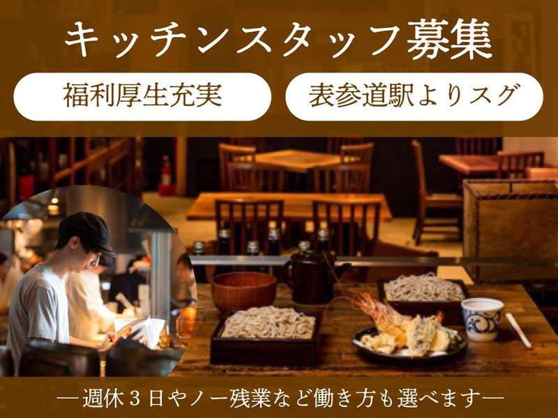 仕事内容 【 新着|求人のPOINT 】 *キッチンでの業務経験1年以上 (業態不問) *選べるノー残業制・週休3日制 *昇給・賞与(年2回)あり *「表参道」駅より徒歩3分 *社割・各種手当など福利厚生充実 ━━━━━━━━━━━━━━━━━ 和食ダイニングでのキッチンスタッフ ━━━━━━━━━━━━━━━━━ 自家製蕎麦と信州地酒を 心ゆくまで愉しめる 和食ダイニング『川上庵』。 わたしたちが大切にしているのは お料理はもちろん、空間やサービス、 きめ細やかな部分まで。 ゆったりとしたジャズが流れる店内で、 より多くのお客様にご満足いただける サービスを提供しています。 来春、品川駅に新店舗をオープン! 今回は新しいお店で活躍してくれる キッチンスタッフを募集します◎ 【 仕事内容 】 ■下ごしらえ ■食材のカット・仕込み ■前菜の盛り付け ■お造り ■煮物、揚げ物 ■蕎麦茹で など カンタンな前菜からスタート! スキルに応じて徐々に お任せしていきます。 蕎麦業態でのご経験者はもちろん、 未経験の方も大歓迎です。 まずはベテランスタッフが イチから丁寧にお教えするので ご安心ください。 【 川上庵について 】 酒の肴と日本酒、 冷えたせいろで締めるといった 江戸時代から暮らしに根付く 粋な食文化を現代に継承しています。 軽井沢に2店舗・都内に3店舗を 展開しています。 【 働き方について 】 飲食業界ではめずらしい <週休3日制>や <ノー残業制>を導入◎ プライベートも大切にでき、 ライフステージに応じて さまざまな働き方が可能なので 腰を据えて長く働けます!