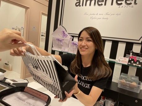 仕事内容 *\店舗での接客・販売のお仕事です!/* *.。.*゚*.。.*゚*.。.*゚*.。.*゚*.。.*゚*. かわいくてお手頃なのに機能的。 身に付けるだけで気分が上がる、 綺麗なボディラインを叶える、 ランジェリーブランド”aimerfeel” 女性を内側からキレイに、Happyに、 そんなお手伝いを一緒にしませんか? <仕事内容> ・接客 ・レジ対応(※遅番はレジ締めあり) ・検品作業 ・品出し ・ディスプレイ ・商品管理・発注 など ご来店されたお客様へ、 フィッティングのご案内や レジ対応などを中心にお任せします。 *.。.*゚*.。.*゚*.。.*゚*.。.*゚*.。.*゚*. *\ 1日の流れを紹介! /* 《出勤・開店準備》 お客様が気持ち良くお買い物できるよう 清掃など開店準備をします。 ▼ 《開店》 接客やレジ、お客様へのご提案、 フィッティングのご案内 など ▼ 《休憩》 ▼ 《休憩後》 接客やレジを中心に店舗業務をお任せ! 合間に品出しなどもお願いします! ▼ 《閉店作業》 翌日の営業に向けて、 レジ締めなどを行います。 ▼ 《退勤》 今日も1日お疲れ様でした★ ※早番/遅番などシフトによって開店準備や 閉店作業など業務内容が異なります。 *.。.*゚*.。.*゚*.。.*゚*.。.*゚*.。.*゚*. *\バイトビギナーも安心!/* 「接客販売は初めて…」そんな方も大丈夫◎ まずはカンタンなお仕事からスタート! 近くに先輩スタッフがいるから、 分からないことはすぐ聞けちゃいます♪ お客様は同年代が多いから、 自然と会話が盛り上がることも! 売上ノルマも一切ないので、 アパレル初挑戦の方にもぴったりです◎ *.。.*゚*.。.*゚*.。.*゚*.。.*゚*.。.*゚*. *\お客様のお悩みを解決!/* 体型や骨格に合わせて、 ぴったりのブラは人それぞれ。 「どれが合うかな?」というお悩みに寄り添って、 お客様に最適な一枚をご提案します♪ 働きながら、下着選びのコツなど “キレイ”に近づく知識も自然と身につきますよ◎ *.。.*゚*.。.*゚*.。.*゚*.。.*゚*.。.*゚*. *\"オシゴト"の両立を応援!/* 「昨日は推しと同じ空気吸ってきました~!」 「平日のミーグリも余裕で行けました!」 「次のイベントのために "推し活貯金"頑張ってるんです!」など 推し活が趣味のスタッフが多数活躍中! 平日にお休みが取れるから、 イベントや舞台などにも 余裕で参加できちゃいます♪ "推し事"も"お仕事"も、どっちも大切にしたい そんなあなたにぴったりの環境です◎ *.。.*゚*.。.*゚*.。.*゚*.。.*゚*.。.*゚*.