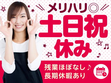 ■休日休暇 有給休暇 夏季休暇 冬期休暇 日曜祝日 5勤2休 GW休暇 慶弔休暇 土日祝休み 年間休日120日以上 完全週休2日制 ※休暇についての補足:完全週休二日制(土日)祝休み、GW、夏季休暇、年末年始休暇、有給休暇、年間休日120日